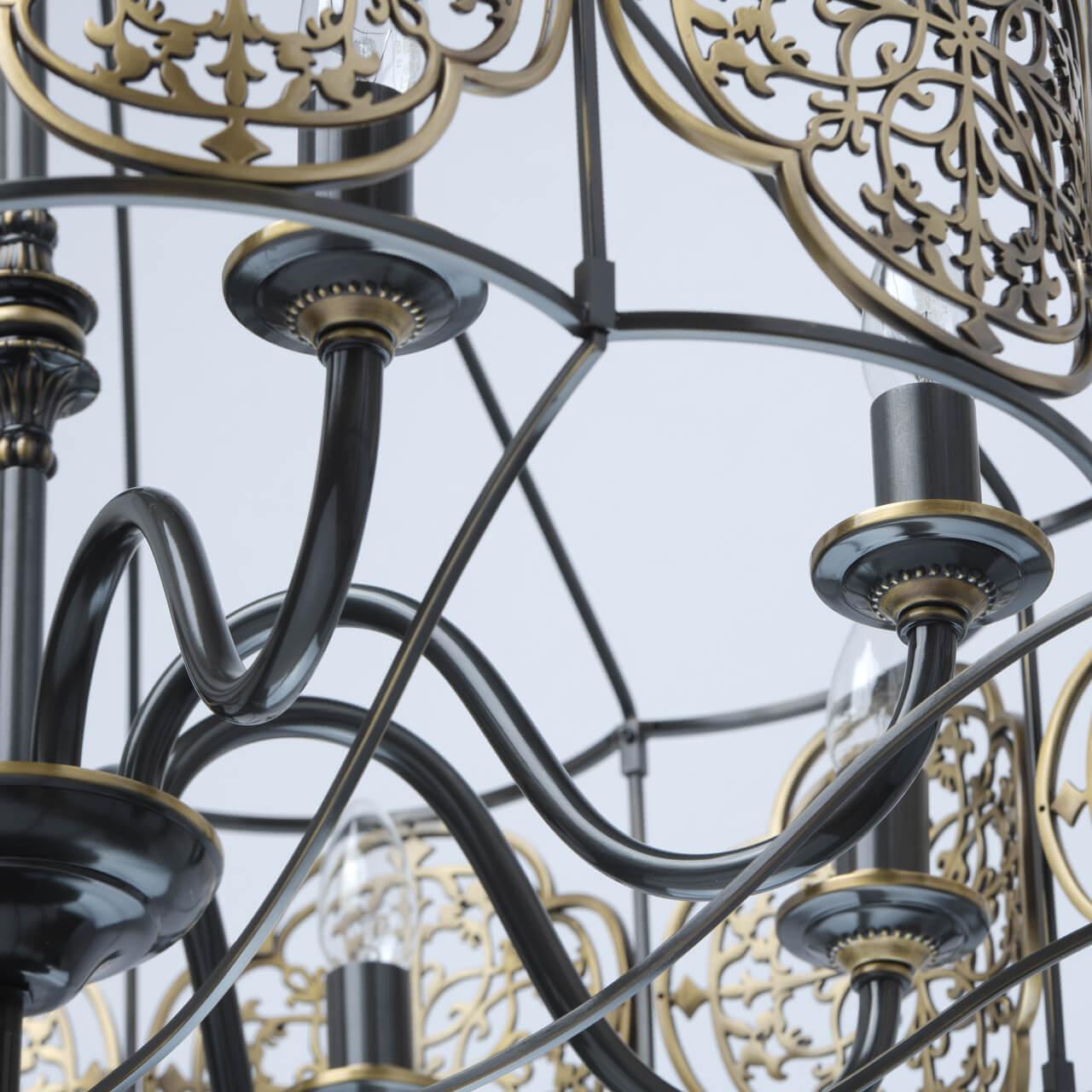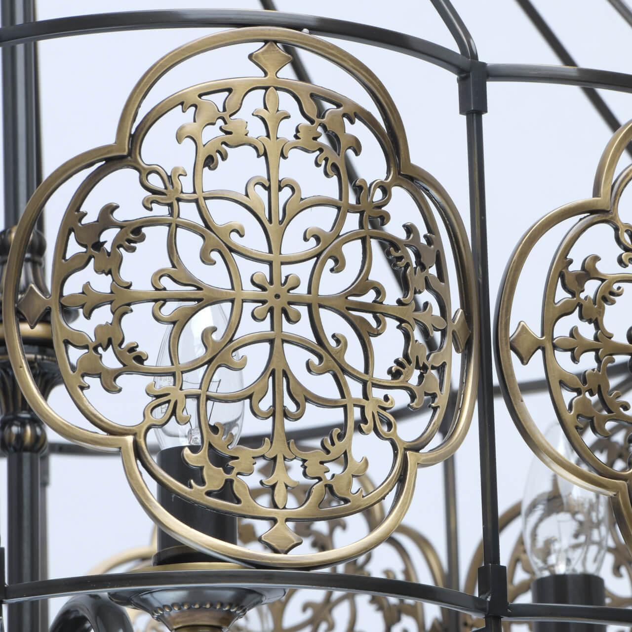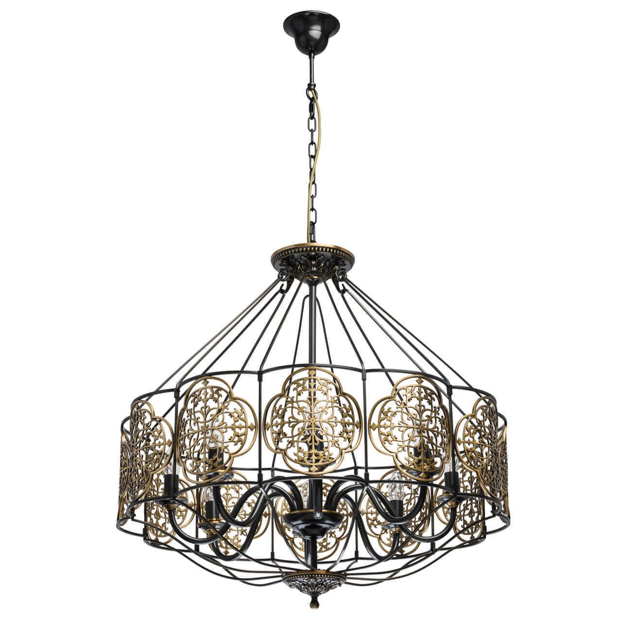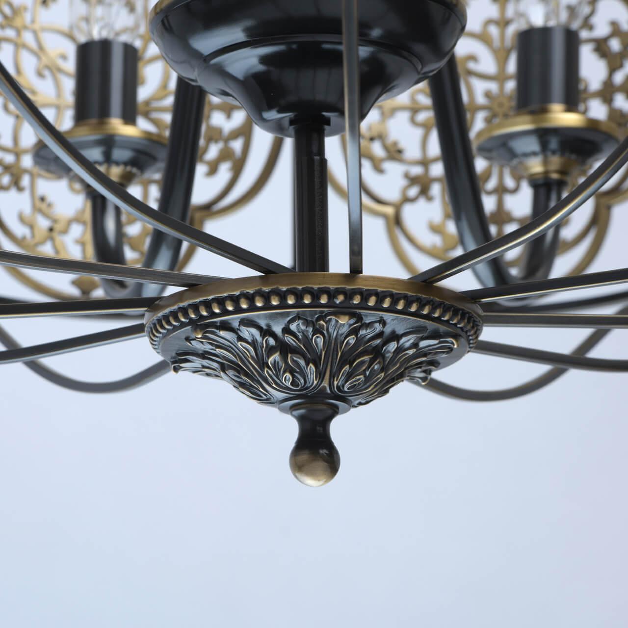 Светильник оснащен восемью лампами с цоколем E14 и общей мощностью 320 Вт, что обеспечивает яркое и равномерное освещение. Металлический плафон и абажур обеспечивают долговечность и надежность конструкции, а латунное основание придает ему дополнительную прочность.
