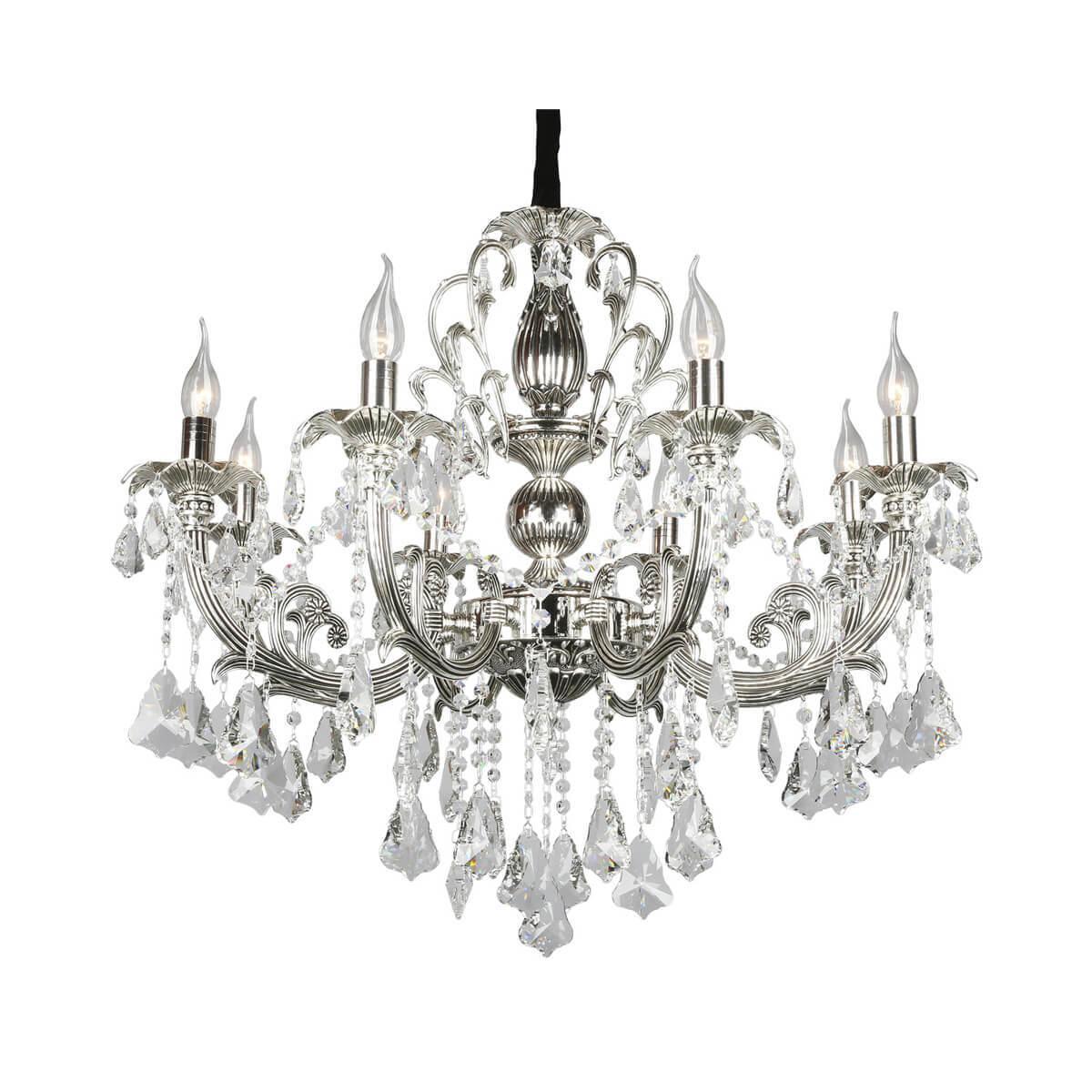 Материал основания - металл, окрашенный в серебристый цвет, что придает люстре изысканный вид. Диаметр люстры составляет 800 мм, а высота - 1500 мм, что позволяет ей замечательно вписаться в интерьер гостиной.