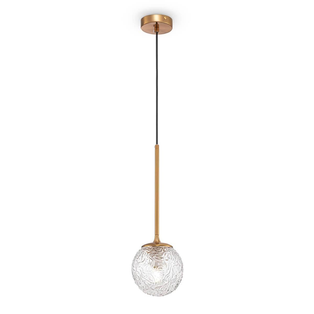 Плафон изготовлен из прозрачного стекла в форме шара диаметром 150 мм, что создает эффектное освещение и приятную атмосферу. Основание выполнено из металла в латунном цвете, что придает светильнику изысканный вид.