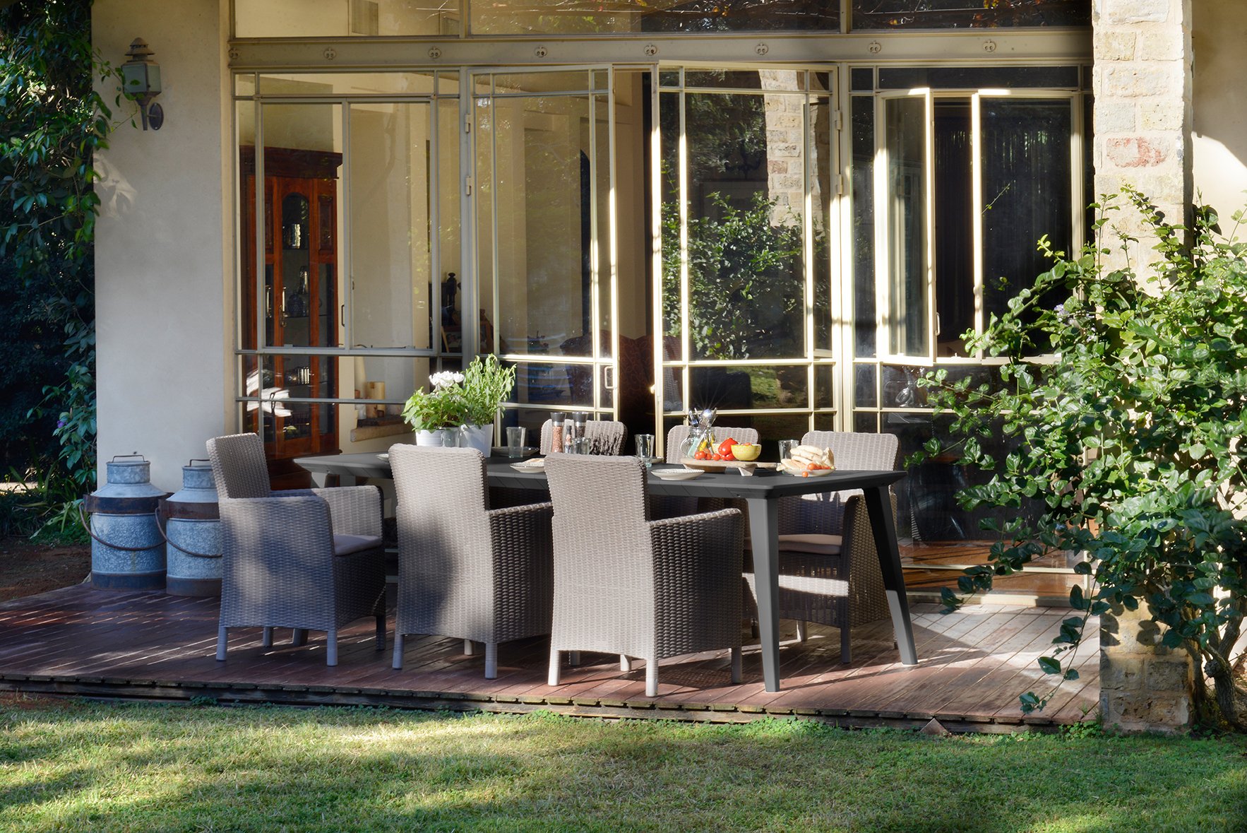Стол подходит для установки в кафе и ресторанах, дома и на даче. Компактный и стильный стол отлично сочетается с любыми стульями KETER. Для любителей необычных сочетаний можно выбрать стулья белого или капучино цвета.