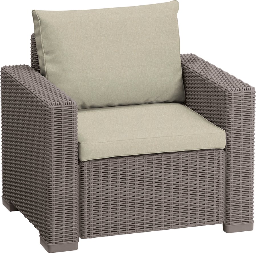 С ранних утренних часов до позднего ночного времени Вы можете отдыхать и расслабляться в комфортном кресле Калифорния. Стильная текстура, имитирующая ротанговое плетение, исключительно широкие подлокотники, подушки сиденья и спинки - благодаря им это кресло идеально подходит для того, чтобы отдыхать в летний день. А поскольку оно изготовлено из устойчивого к погодным условиям пластика с защитой от ультрафиолетового излучения, Вы будете им наслаждаться на протяжении многих сезонов, не заботясь об уходе.