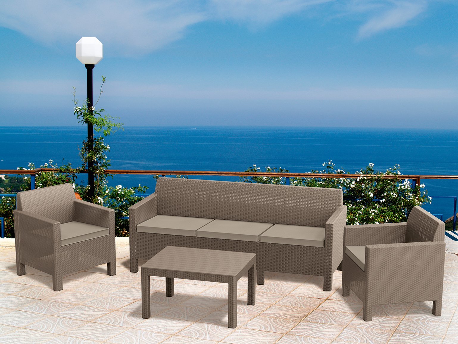 Комплект мебели под искусственный ротанг Orlando Set с трехместным диваном. Достаточно высокие для таких комплектов ножки - добавляют особый шарм и легкость данному комплекту. Столешница выполнена "под дерево", благодаря чему стол еще легче мыть.