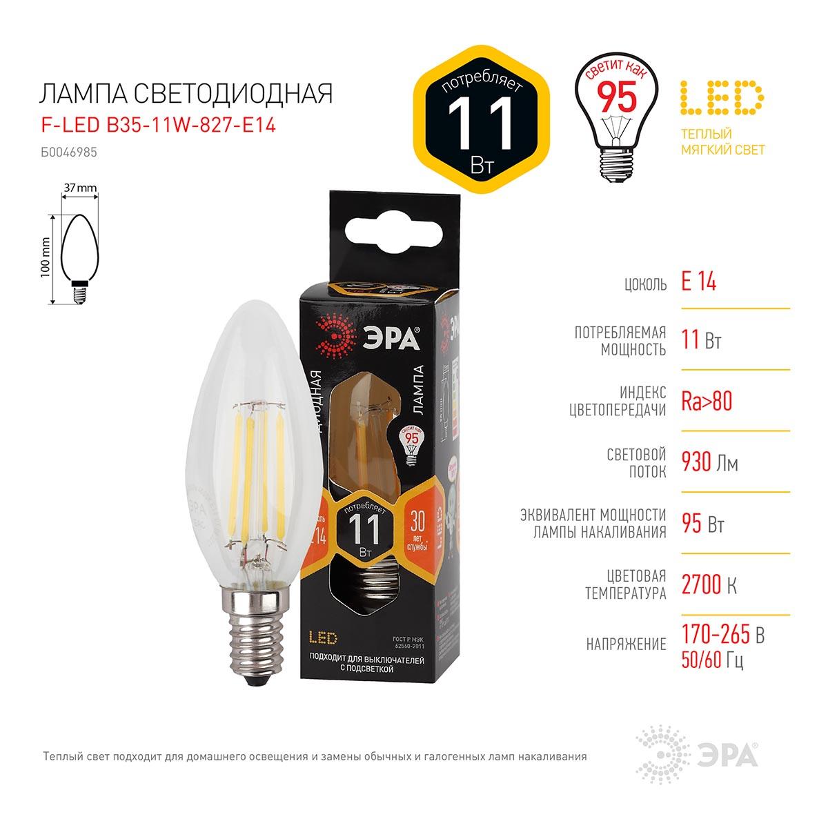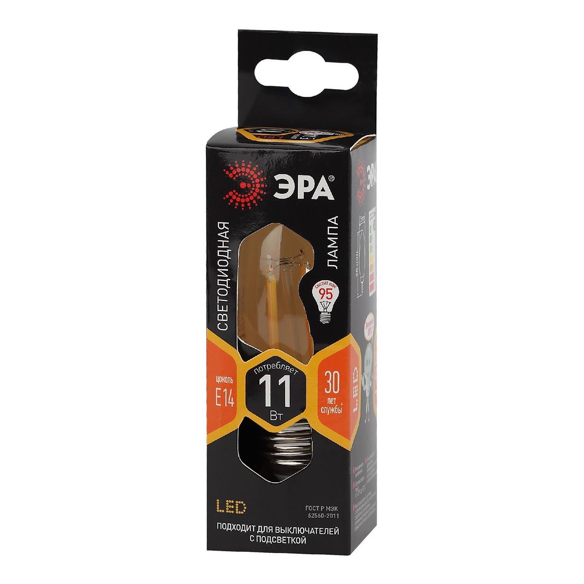 Лампа светодиодная филаментная ЭРА E14 11W 2700K прозрачная F-LED B35-11w-827-E14 Б0046985
