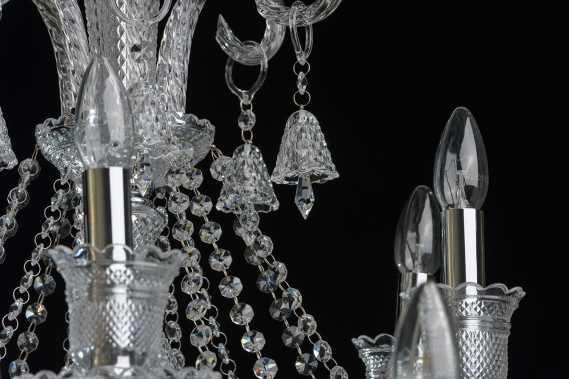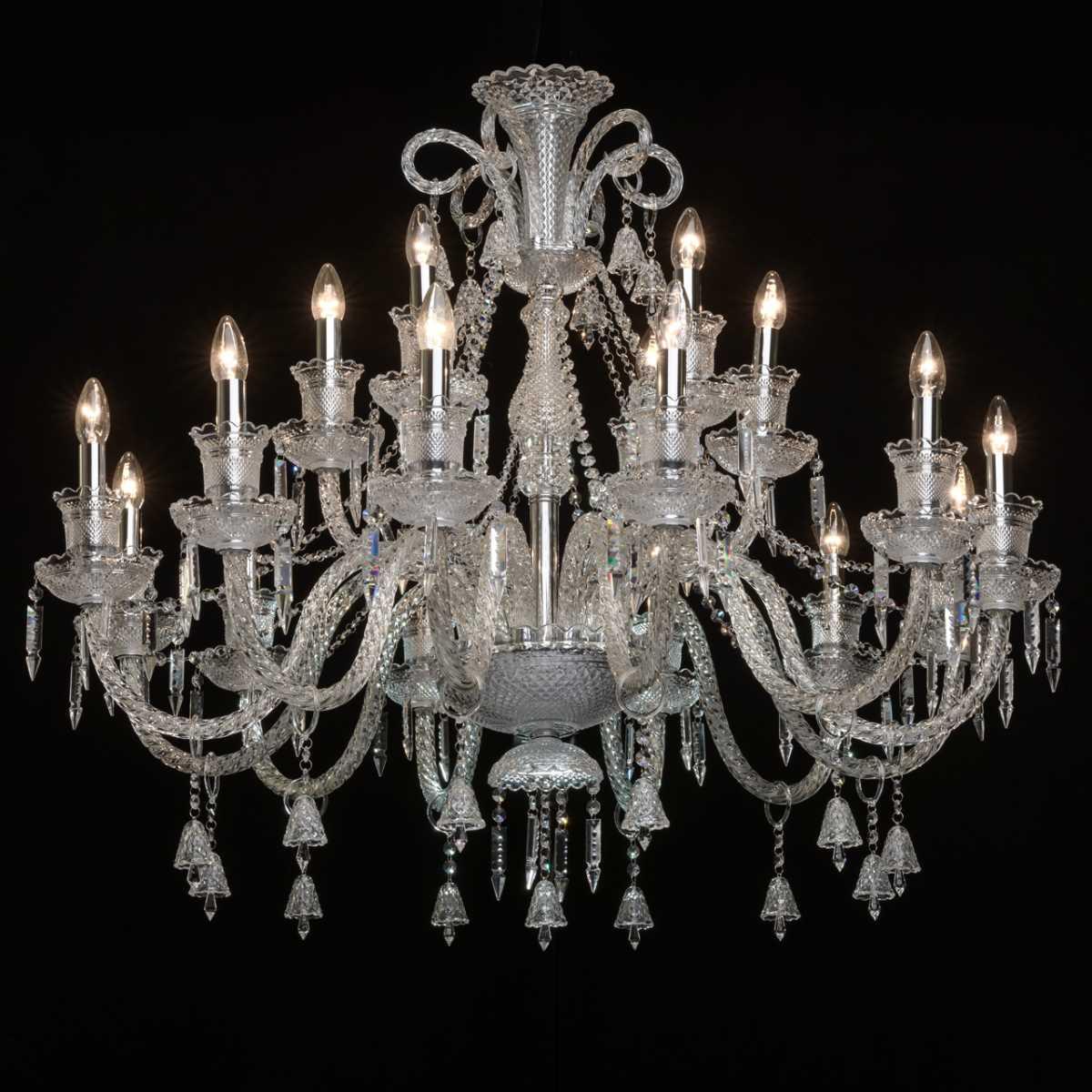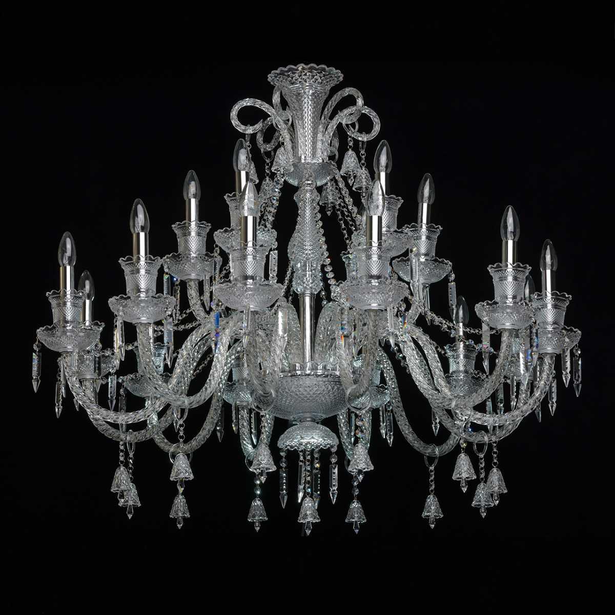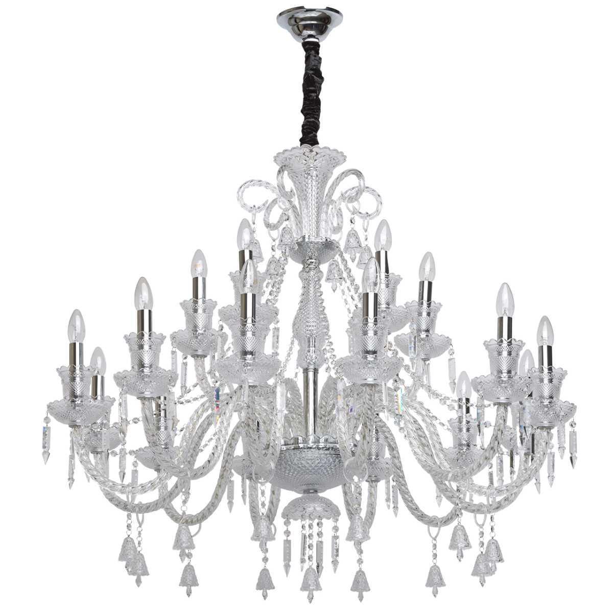Люстра оснащена 18 лампочками с цоколем E14 и общей мощностью 720 Вт. Материал основания - металл, а цвет основания и плафона - хром. Хрустальные элементы добавляют изысканности и блеска этому светильнику.