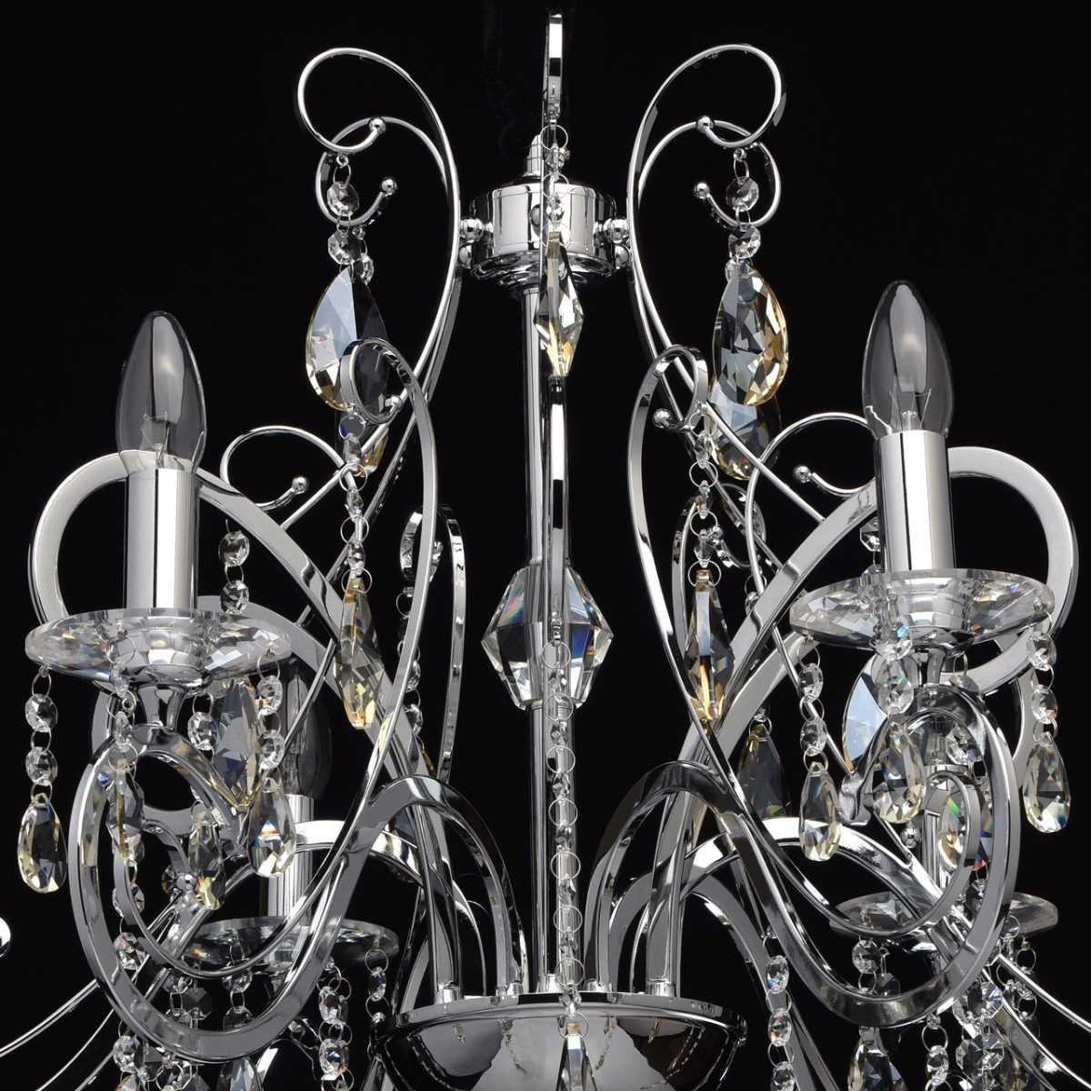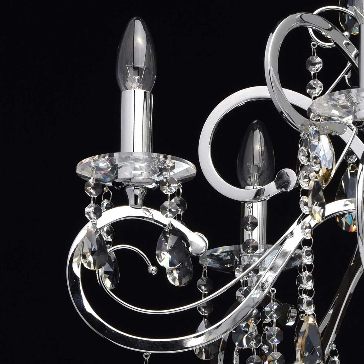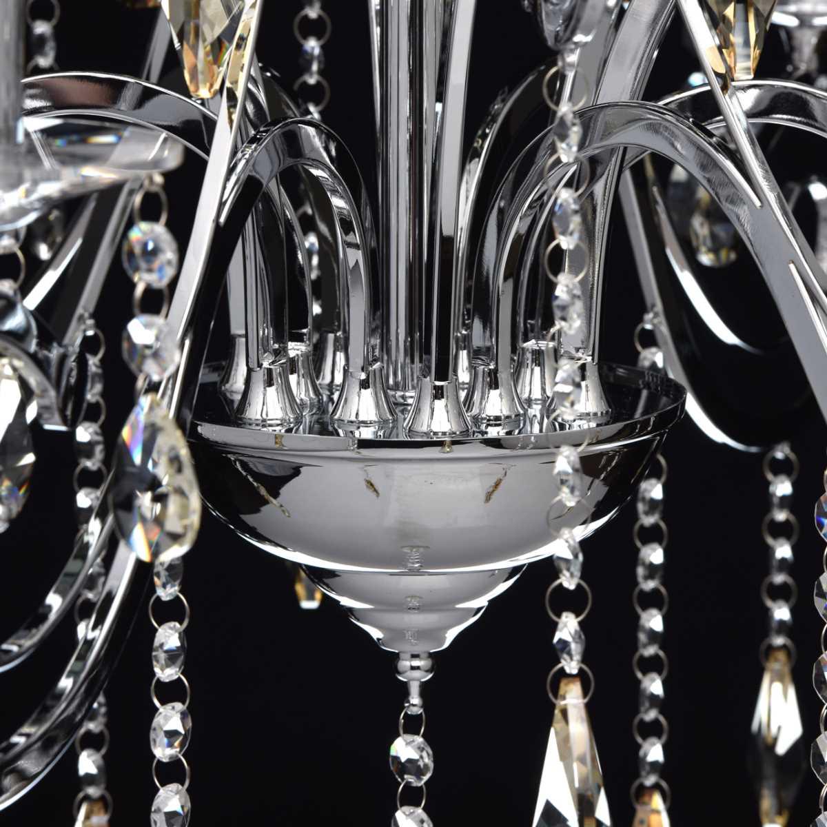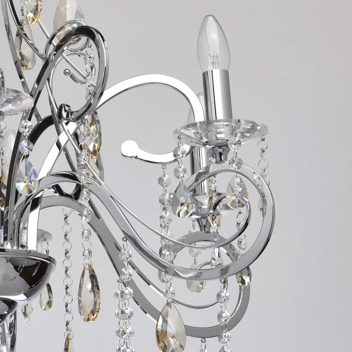 Материал основания - металл, окрашенный в хромированный цвет, что придает люстре элегантный вид. Диаметр светильника составляет 780 мм, а высота - 1220 мм. Хрустальные элементы добавляют изысканности и блеска.