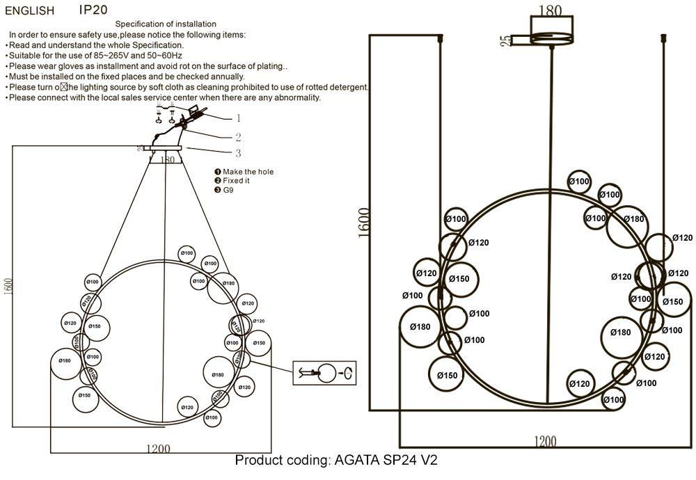 Плафон и абажур изготовлены из стекла прозрачного цвета, а основание - из черного металла. Диаметр люстры составляет 1200 мм, а высота - 1600 мм. Стиль хай-тек делает эту люстру современной и стильной.