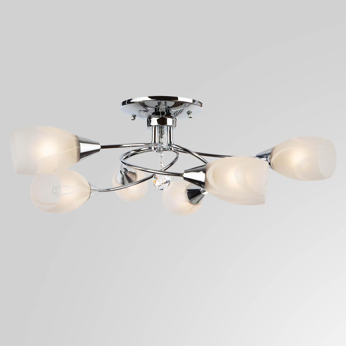 Благодаря белому цвету плафона и основания с хромированными элементами, данная люстра легко сочетается с любым интерьером. Она подойдет как для гостиной, так и для спальни или кухни.