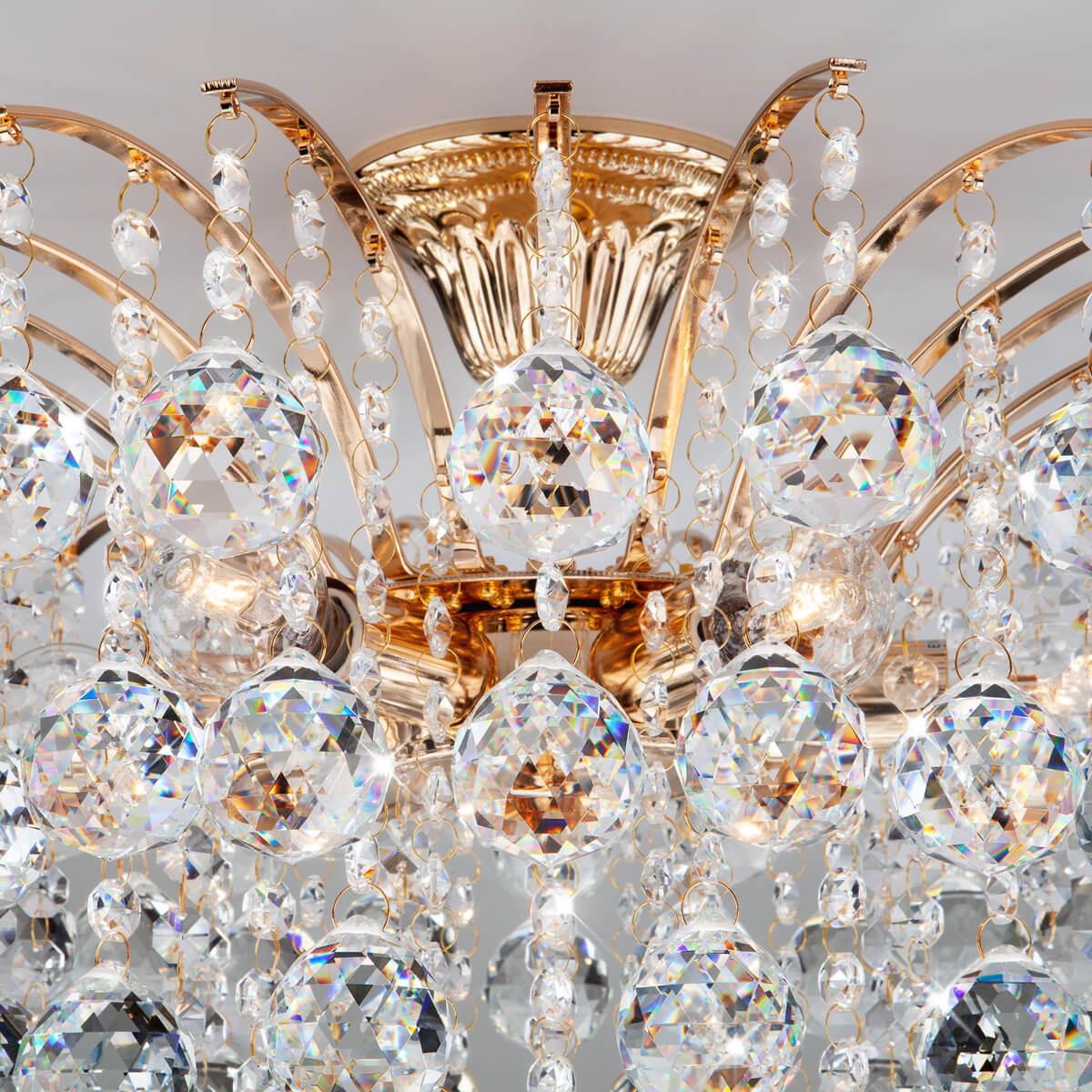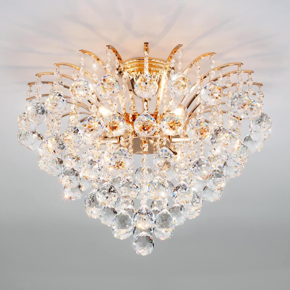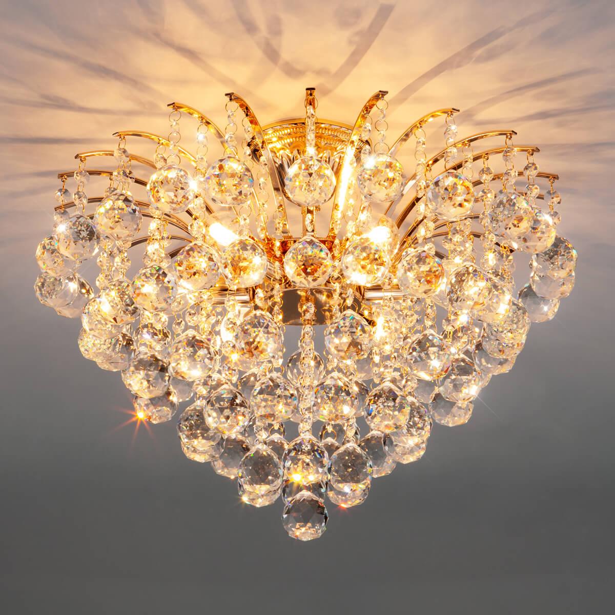 Плафон и абажур из хрусталя создают игру света и тени, придавая особый шарм освещению. Диаметр люстры составляет 480 мм, а высота - 370 мм, что делает ее заметным элементом интерьера. Установка на потолок обеспечивает удобство использования и экономию места.