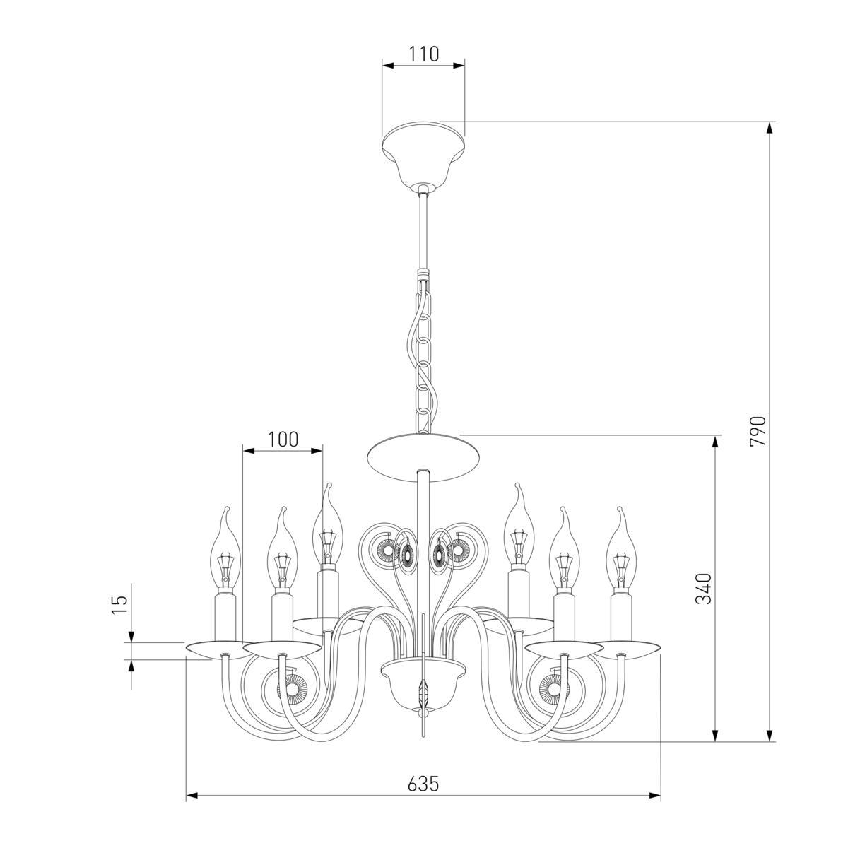 Для установки на потолок предусмотрены шесть цоколей типа E14, в которые можно установить лампочки накаливания мощностью до 60 Вт каждая. Общая мощность люстры составляет 360 Вт, что обеспечивает достаточное освещение помещения.
