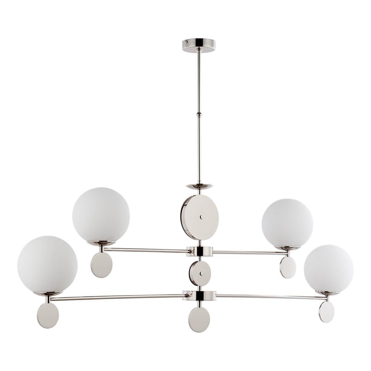 Подвесная люстра Kutek Dimaro DIM-ZWL-4(BN) - это стильное и функциональное освещение для кухни, произведенное в Польше. Люстра из коллекции Dimaro имеет американский стиль и выполнена из высококачественных материалов.Эта подвесная люстра оснащена четырьмя лампами с цоколем E27 и общей мощностью 160 Вт. Высота люстры составляет 700 мм, диаметр плафона - 1250 мм. Материал плафона и абажура - стекло, цвет - белый. Основание выполнено из металла с отделкой под хром.