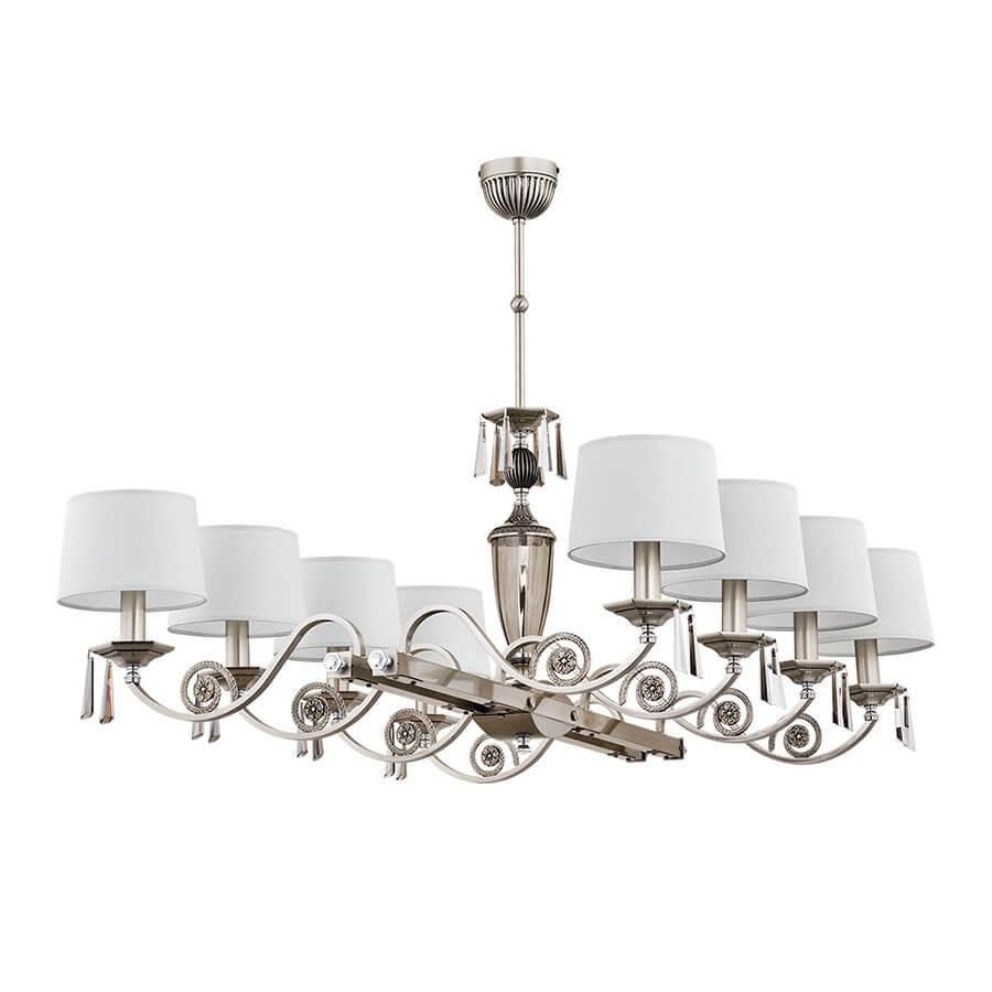 Люстра оснащена восемью лампами с цоколем E14 и общей мощностью 320 Вт. Материал плафона и абажура выполнен из ткани, что придает освещению мягкость и теплоту. Основание изготовлено из металла в матовом никелевом цвете, что придает изделию элегантный и современный вид.