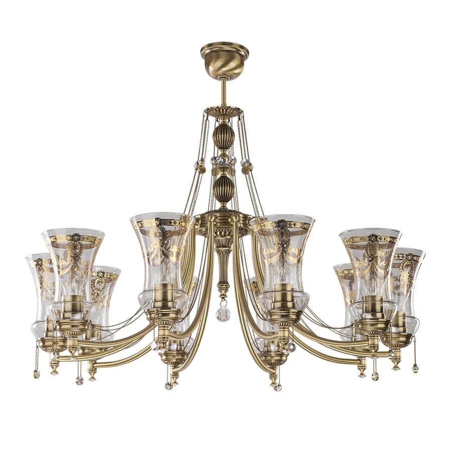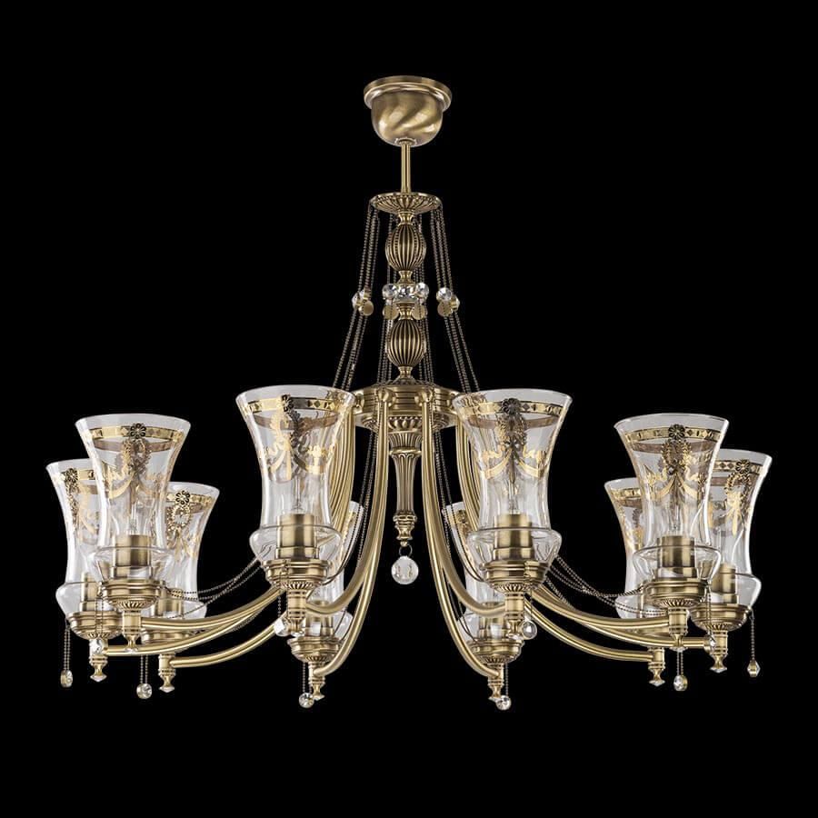 Основание люстры выполнено из латуни в бронзовом цвете, что придает ей изысканный вид. Диаметр люстры составляет 800 мм, а высота - 650 мм, что делает ее заметным элементом интерьера. Установка производится на потолок, что позволяет равномерно распределить свет по всему помещению.
