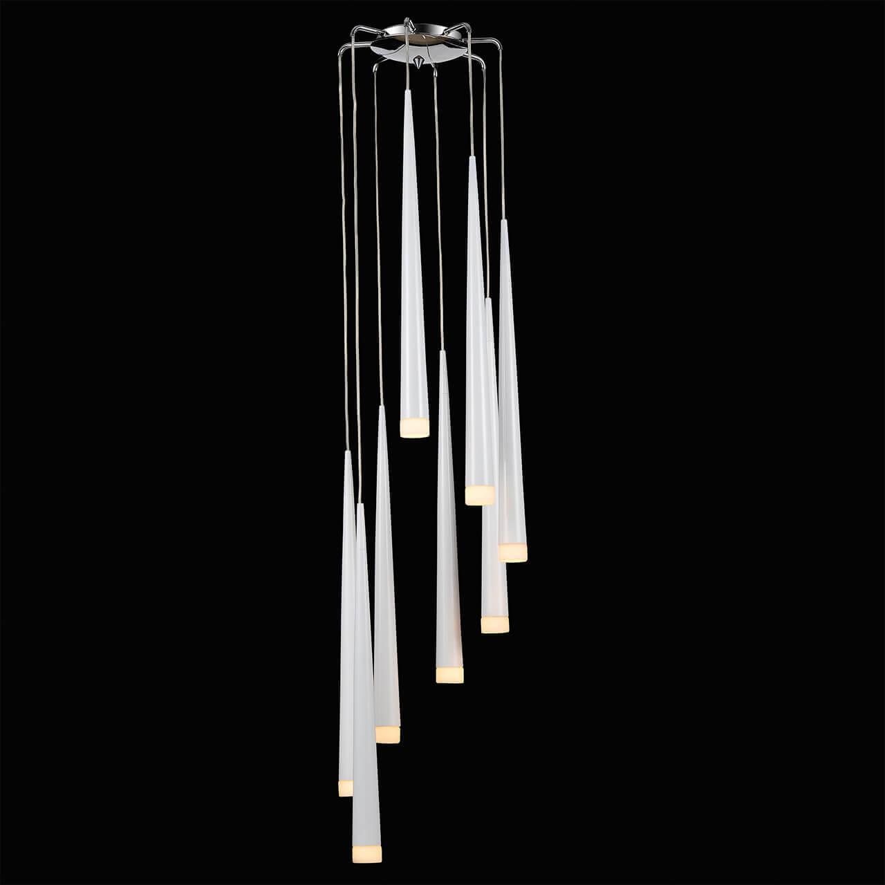 Основание люстры выполнено из металла с отделкой под хром, что придает ей современный и стильный вид. Цвет плафона и абажура - белый, что позволяет легко вписать люстру в любой интерьер. Степень защиты IP20 гарантирует безопасность использования внутри помещения.