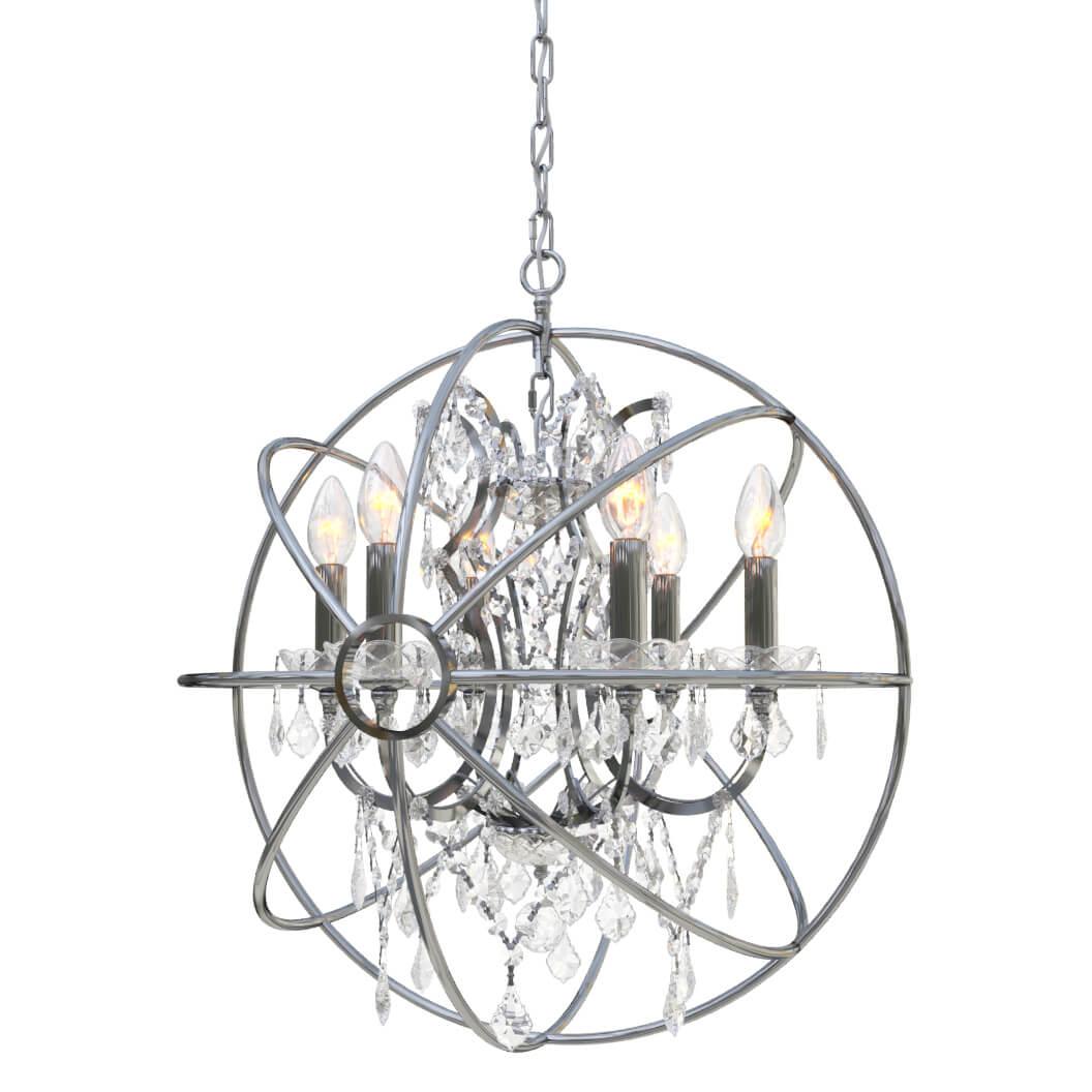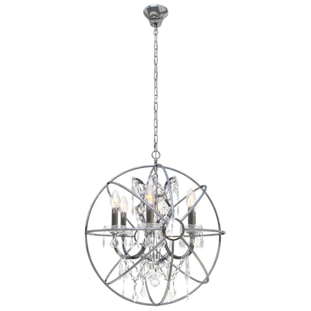 Материал основания - металл с отделкой под хром, что придает люстре современный и стильный вид. Абажуры отсутствуют, что делает свет более ярким и направленным. Цвет хрома и хрустальные элементы придают люстре изысканный и роскошный вид.