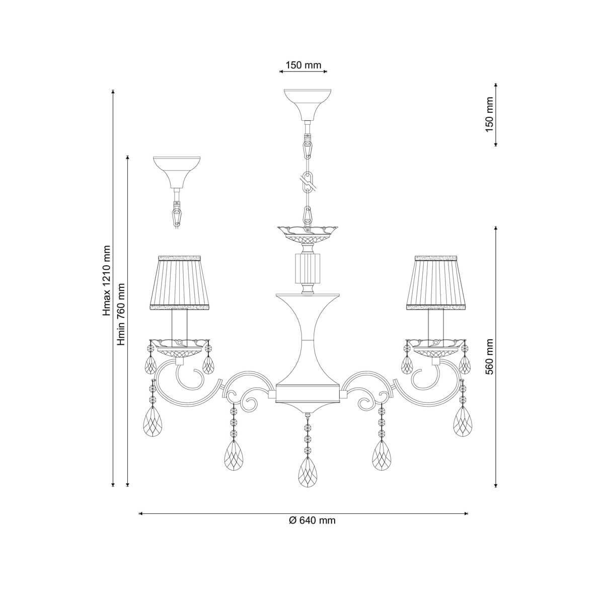 Каждый плафон оснащен цоколем E14 для ламп накаливания мощностью до 60 Вт. Общая мощность люстры составляет 360 Вт. Напряжение питания 220-240 В. Степень защиты IP20 обеспечивает безопасность использования.
