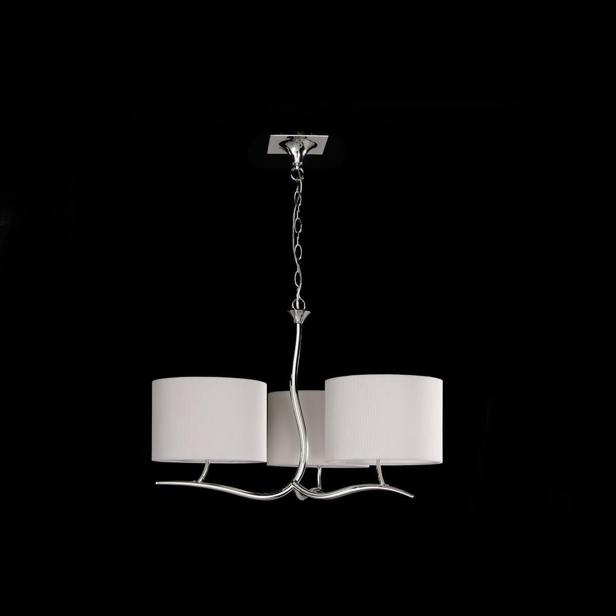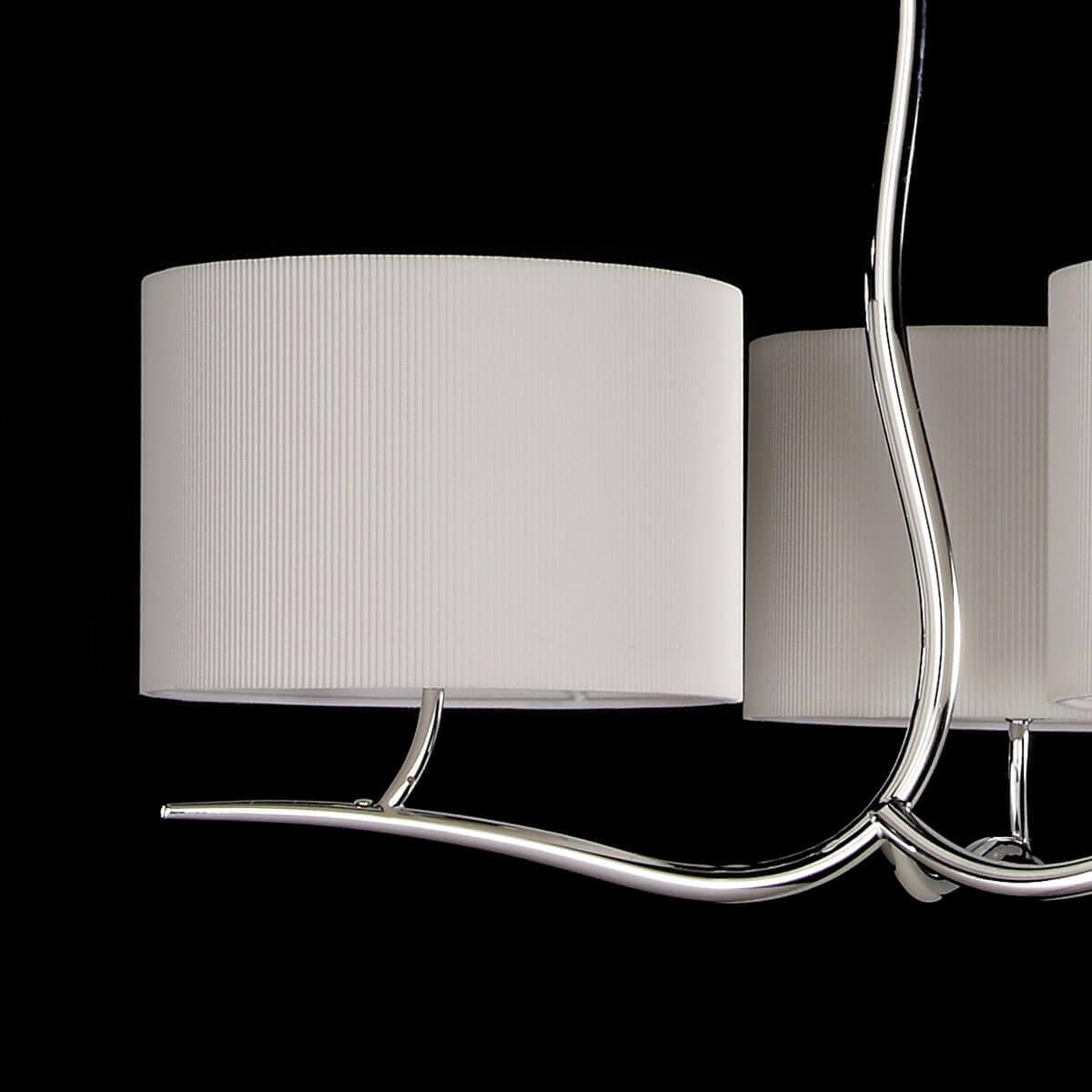 Плафон и абажур изготовлены из качественной ткани белого цвета, что придает люстре легкость и изящность. Основание выполнено из металла с отделкой под хром, что придает изделию современный и стильный вид.
