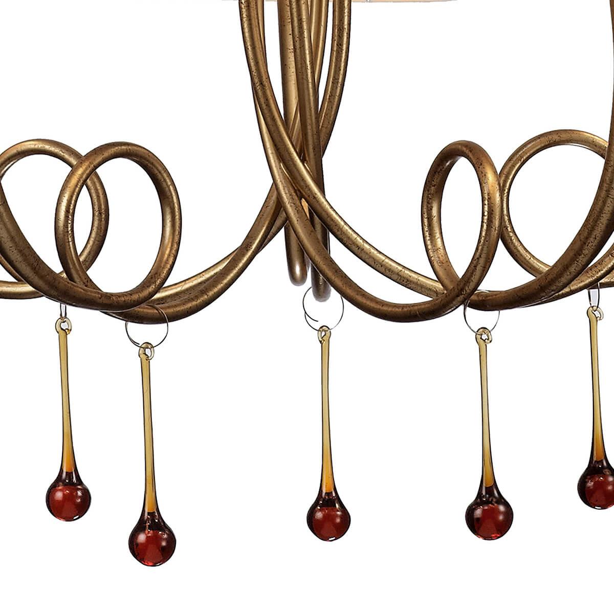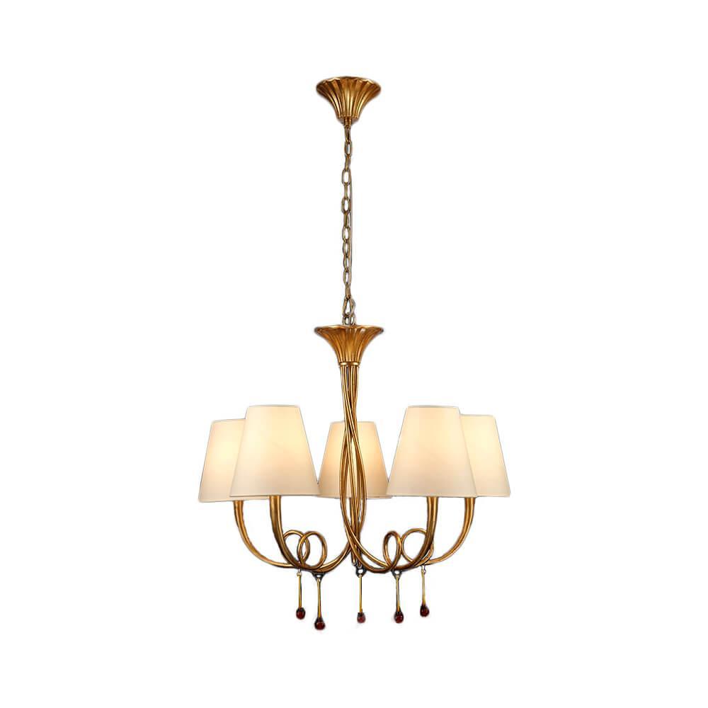 Плафон и абажур изготовлены из качественной ткани в кремовом цвете, что придает освещению мягкость и уют. Основание выполнено из металла в золотистом оттенке, что придает люстре изысканный вид. Степень защиты IP20 гарантирует безопасность использования внутри помещения.