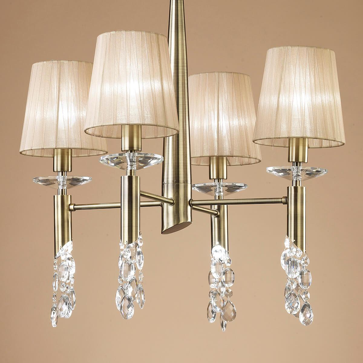 Основание люстры выполнено из металла в античной латуни, что придает изделию изысканный вид. Цветовая гамма в бежевых тонах делает эту люстру универсальной и легко сочетаемой с различными интерьерами. Степень защиты IP20 гарантирует безопасность использования в помещениях.