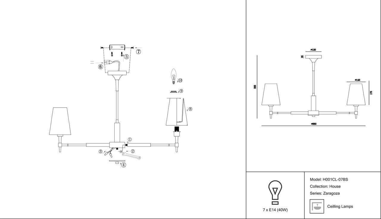 Этот элемент освещения работает от лампочек с цоколем E14 и мощностью 40 Вт каждая. Общая мощность люстры составляет 280 Вт. Напряжение питания 220-240 В. Люстра предназначена для использования в помещениях с защитой IP20.