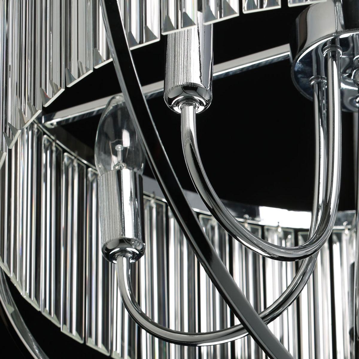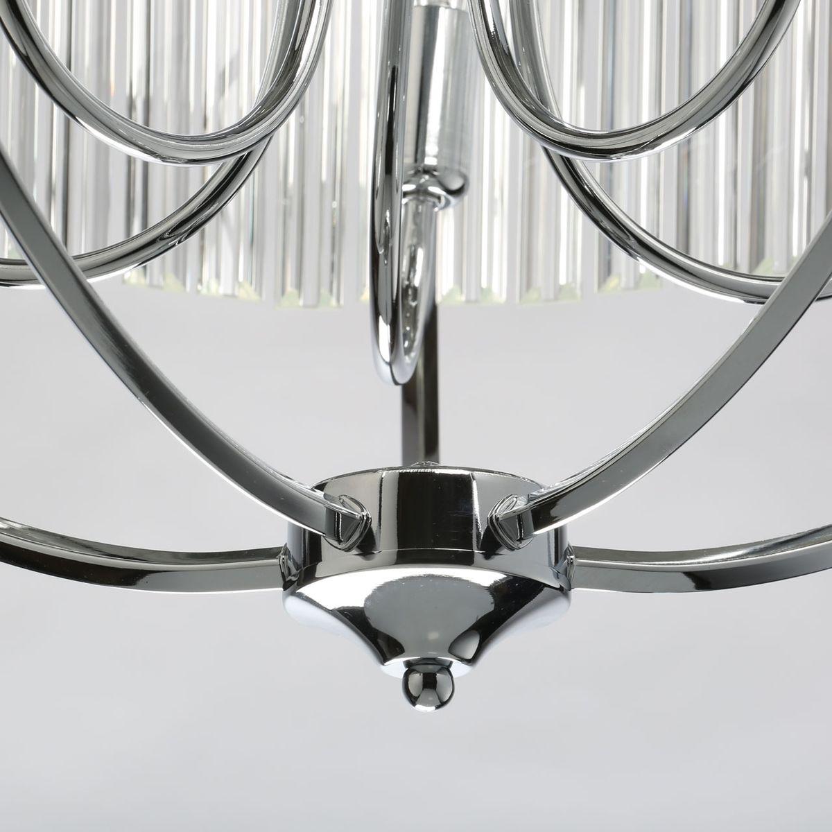 Люстра выполнена в американском стиле и имеет пять плафонов из хрусталя, которые создают красивые отражения света. Материал основания - металл с хромированным покрытием, что придает изделию дополнительный блеск и элегантность.