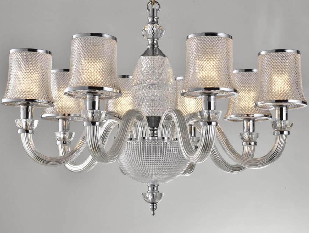 Светильник работает от восьми лампочек с цоколем E14 и мощностью 60 Вт каждая, общая мощность составляет 480 Вт. Напряжение 220-240 В обеспечивает стабильное и яркое освещение в помещении. Цветовая гамма хрома и прозрачного стекла делает эту люстру универсальной и легко сочетаемой с любым цветовым решением интерьера.