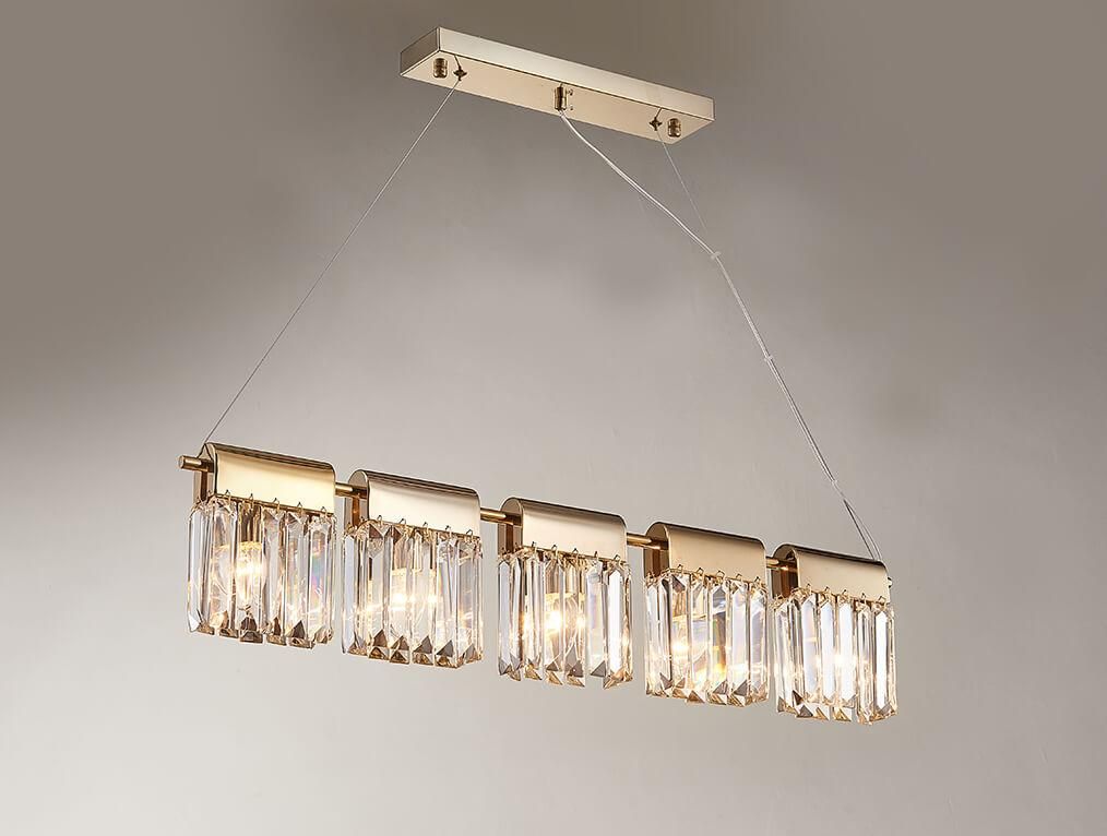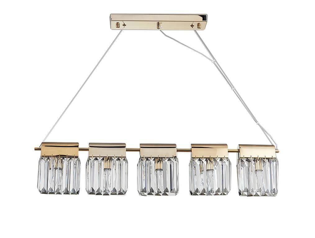 Высота подвесной люстры составляет 180 мм, а форма плафона - прямоугольная. Основание изготовлено из металла и окрашено в золотой цвет. Надежная установка на потолок обеспечивает долгий срок службы изделия.