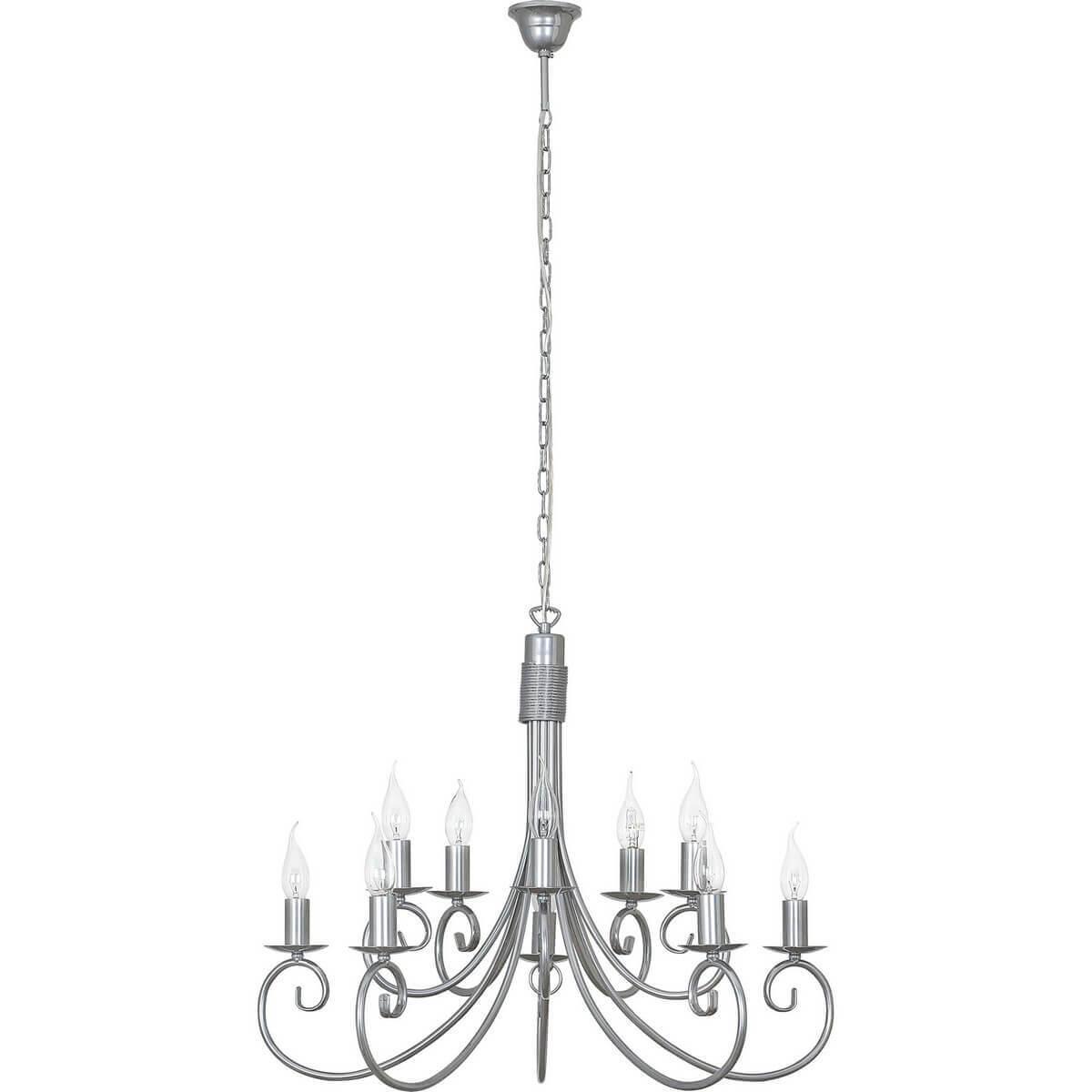 Люстра оснащена 10 лампочками с цоколем E14 и общей мощностью 600 Вт. Материал основания - металл, цвет основания - серебро. Диаметр люстры составляет 750 мм, а высота - 450 мм. Тип лампочки - накаливания, степень защиты IP20.