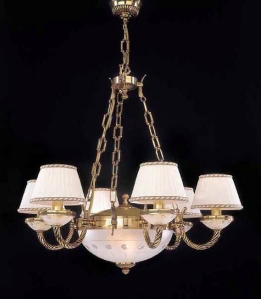 Подвесная люстра Reccagni Angelo L.4760/6+2 - это изысканное освещение для гостиной в классическом стиле от итальянского бренда Reccagni Angelo. Артикул L.4760/6+2 из коллекции Bronze 4760 представляет собой элегантную люстру с восемью лампами мощностью 60 Вт каждая.Высота подвесной люстры составляет 720 мм, диаметр - 720 мм. Основание изготовлено из латуни в золотистом цвете, а плафон выполнен из стекла в форме конуса, окрашенного в белый цвет. Текстильные элементы также присутствуют в дизайне люстры.