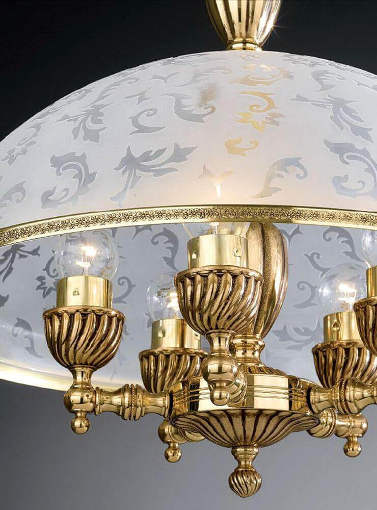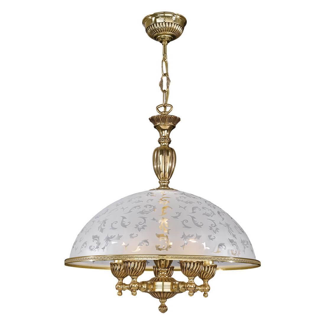 Подвесная люстра Reccagni Angelo L.6302/48 - это изысканное освещение для спальни, выполненное в классическом стиле итальянского бренда Reccagni Angelo. Артикул L.6302/48 из коллекции verde 6302 представляет собой элегантную подвесную люстру с пятью лампами мощностью 60 Вт каждая.Высота подвесной люстры составляет 560 мм, диаметр плафона - 480 мм. Материал плафона и абажура - стекло белого цвета, форма плафона - полукруглая. Основание выполнено из латуни в золотистом цвете, что добавляет изысканности и роскоши данной модели.