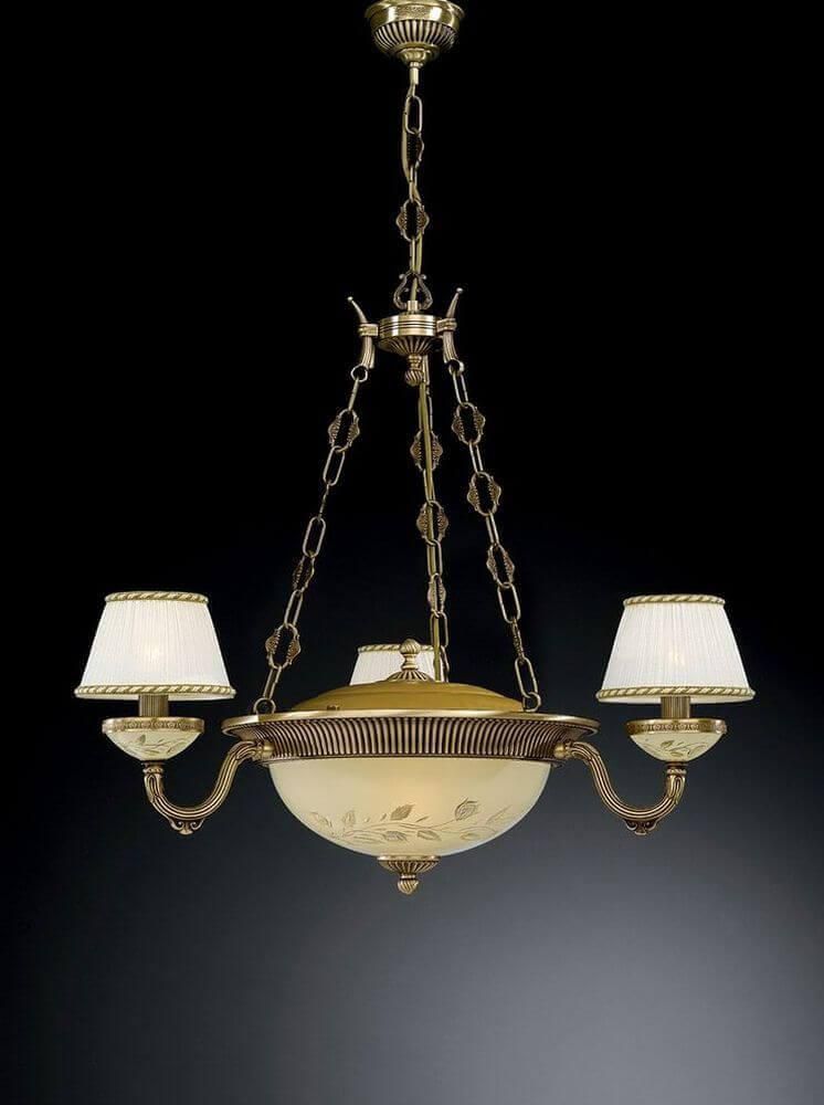 Плафон и абажур выполнены из стекла, а основание из латуни в античной бронзовой отделке, что придает люстре изысканный вид. Цвет плафона - светло-желтый, что создает мягкое и приятное освещение.