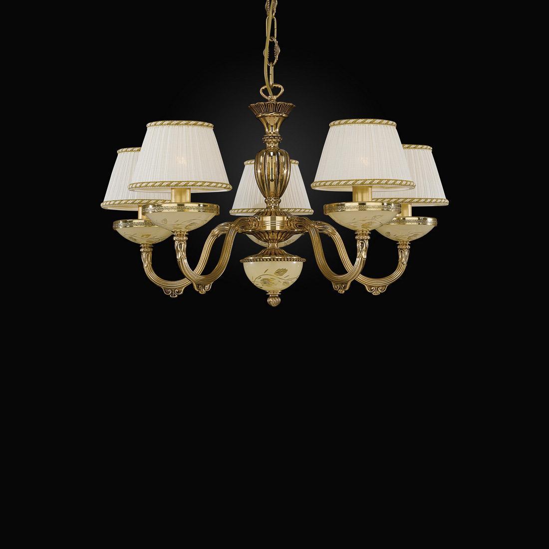 Цветовое решение подвесной люстры Reccagni Angelo L 6422/5 включает в себя белый цвет основания и светло-желтый цвет плафона, что создает уютную атмосферу в помещении. Лампочки накаливания обеспечивают теплый свет, который придает помещению уют и комфорт.