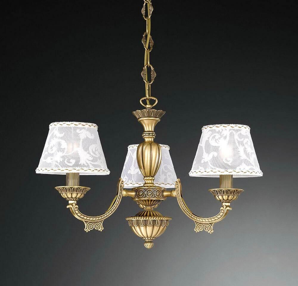 Подвесная люстра Reccagni Angelo L.7432/3 - это изысканное освещение для спальни, которое добавит в интерьер нотку классики и элегантности. Произведенная в Италии, данная люстра отличается высоким качеством материалов и изысканным дизайном.Люстра оснащена тремя лампами с цоколем E14 и общей мощностью 180 Вт. Плафон и абажур изготовлены из ткани белого цвета, что придает освещению мягкость и уют. Диаметр плафона составляет 520 мм, а высота - 340 мм. Основание выполнено из латуни в античной бронзовой отделке, что придает люстре изысканный вид.
