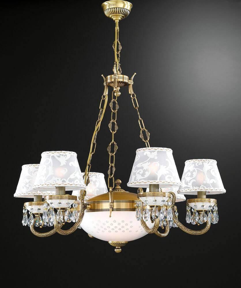 Подвесная люстра Reccagni Angelo L 8281/6+2 - это изысканное освещение для гостиной в классическом стиле от итальянского бренда Reccagni Angelo. Артикул L 8281/6+2 из коллекции rosa 8281 представляет собой элегантную люстру с восемью лампами, выполненными в виде накаливания с цоколем E27 и общей мощностью 480 Вт.Высота подвесной люстры составляет 680 мм, диаметр - 740 мм. Плафон и абажур изготовлены из ткани белого цвета, что придает освещению нежный и романтичный оттенок. Основание выполнено из металла в бронзовом цвете, что придает изделию дополнительную изысканность.