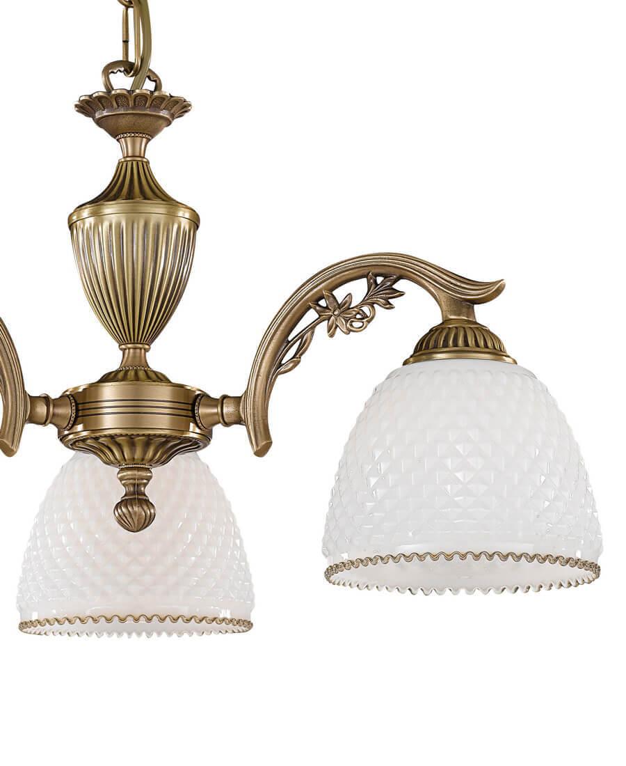 Плафон и абажур выполнены из стекла белого цвета, что придает люстре изысканный и изящный вид. Основание изготовлено из латуни в античной бронзовой отделке, что добавляет изделию шарма и роскоши.