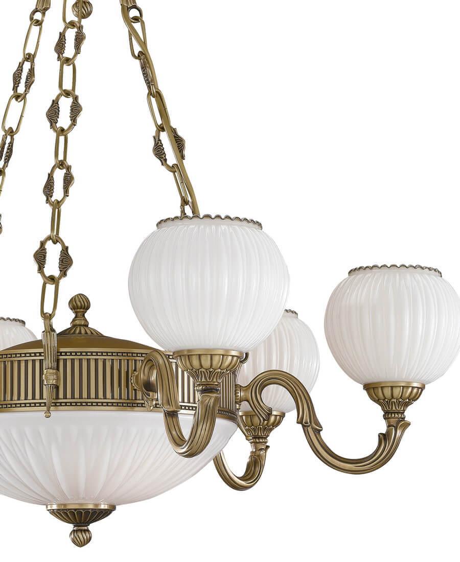 Плафон и абажур изготовлены из стекла белого цвета, что придает люстре изысканный и изящный вид. Диаметр плафона составляет 800 мм, а высота - 700 мм. Основание выполнено из латуни в античной бронзовой отделке, что придает ему дополнительную прочность и долговечность.