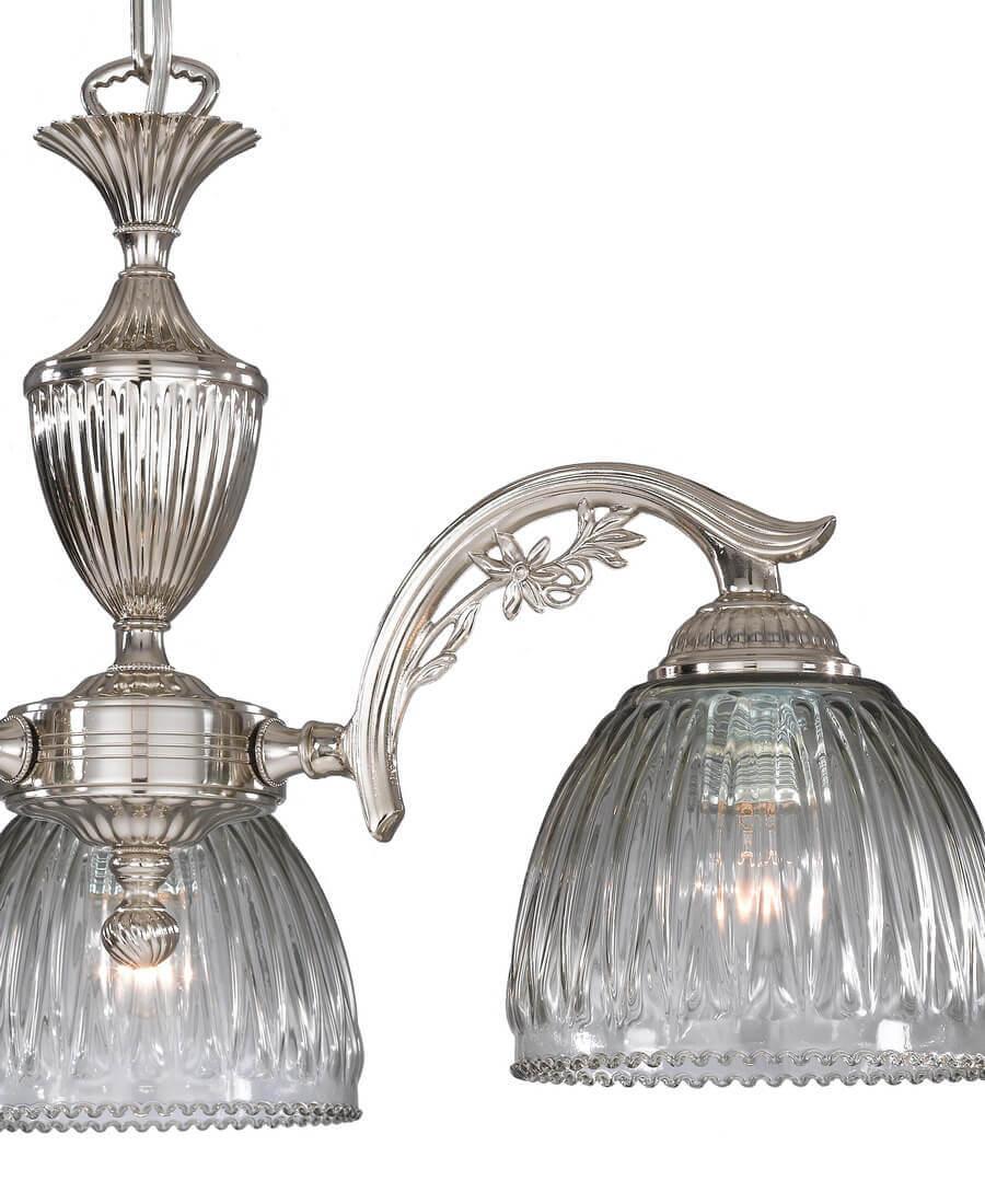 Плафон и абажур изготовлены из стекла серого цвета с дымчатым оттенком, что придает освещению мягкий и приятный оттенок. Основание выполнено из металла с никелевым покрытием, что придает люстре долговечность и надежность.