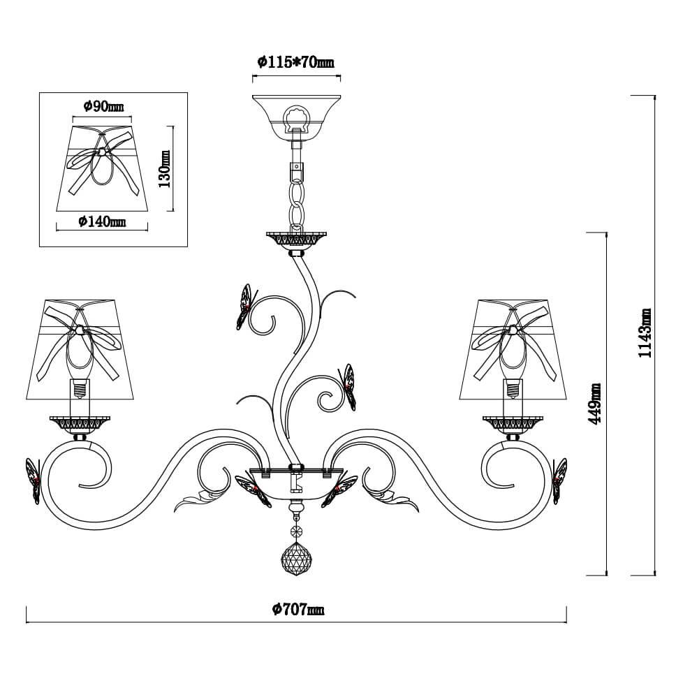 Основание изготовлено из металла белого цвета, что создает контраст с тканевым плафоном. Люстра имеет степень защиты IP20, что позволяет использовать ее в сухих помещениях.