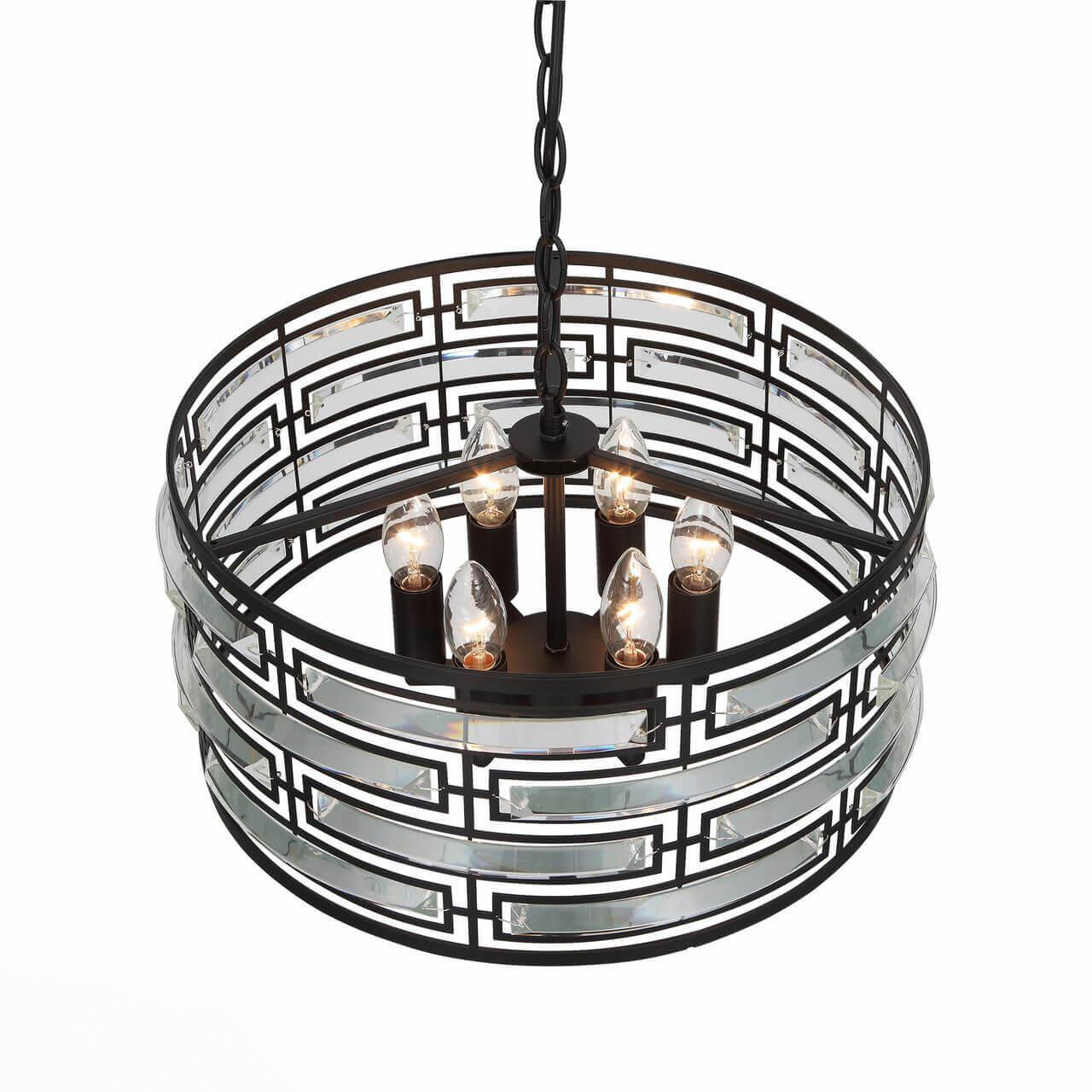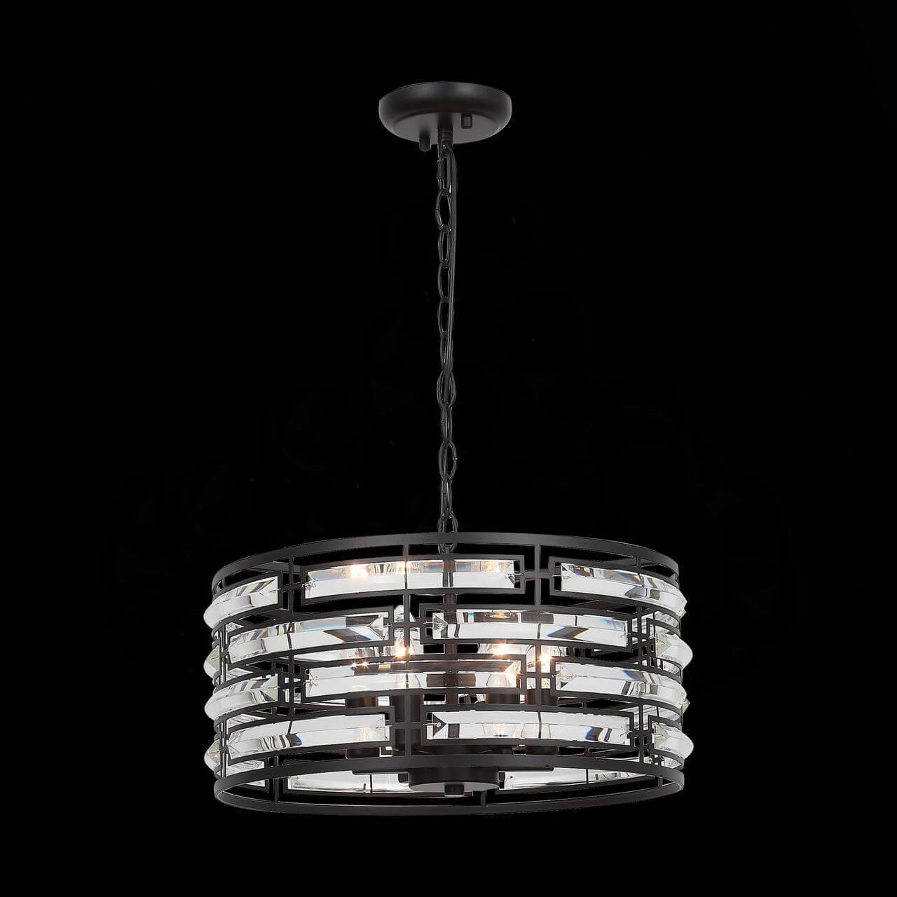 Плафон и абажур изготовлены из хрусталя, что придает люстре изысканный вид. Цвет плафона прозрачный, а основание выполнено из черного металла. Диаметр плафона составляет 415 мм, а высота - 195 мм. Форма плафона - цилиндр.