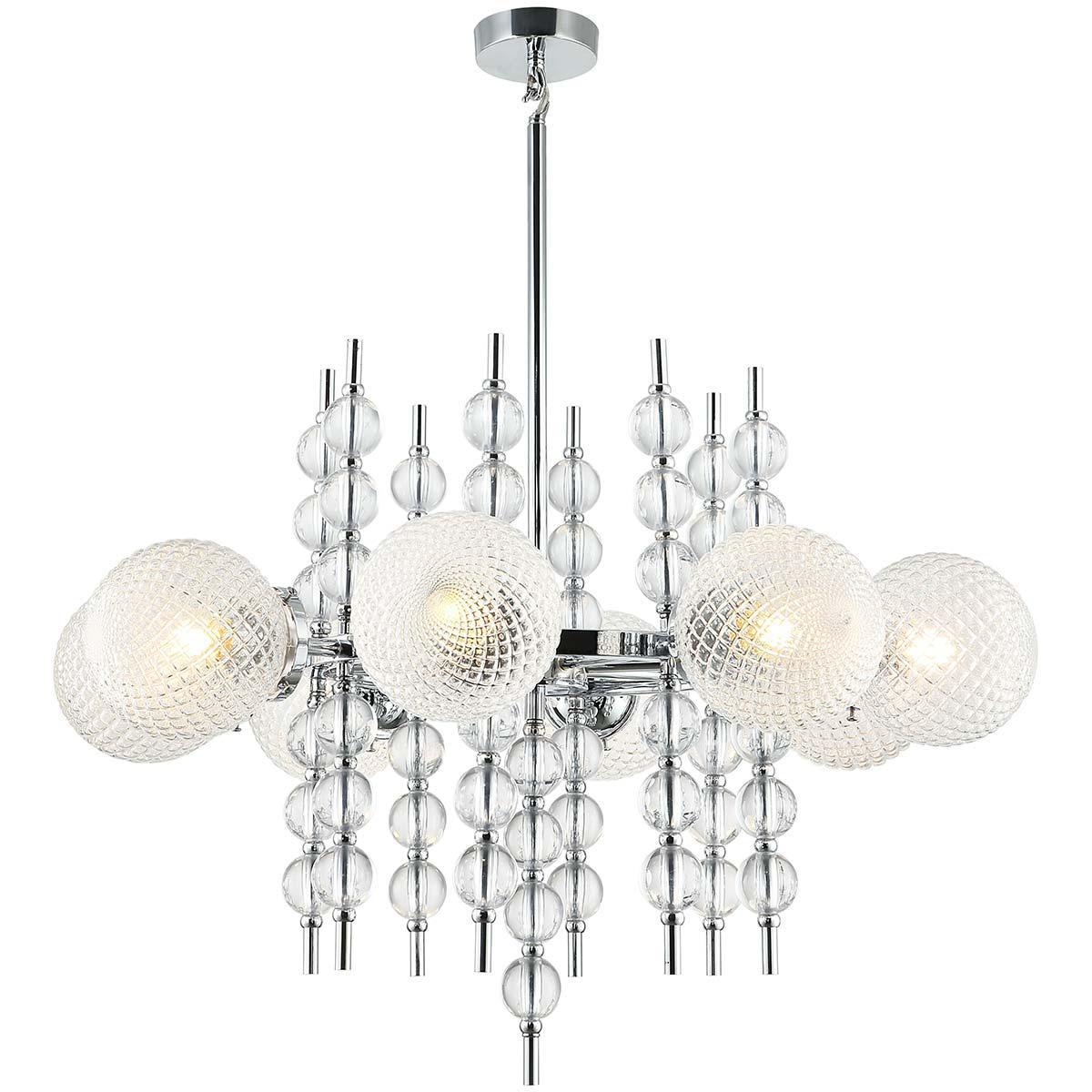 Люстра оснащена восемью лампочками с цоколем E27 и общей мощностью 320 Вт, что обеспечивает достаточное освещение помещения. Материал плафона и абажура - стекло, что придает изделию легкость и изысканность. Основание выполнено из металла с хромированным покрытием, что придает ему современный и стильный вид.