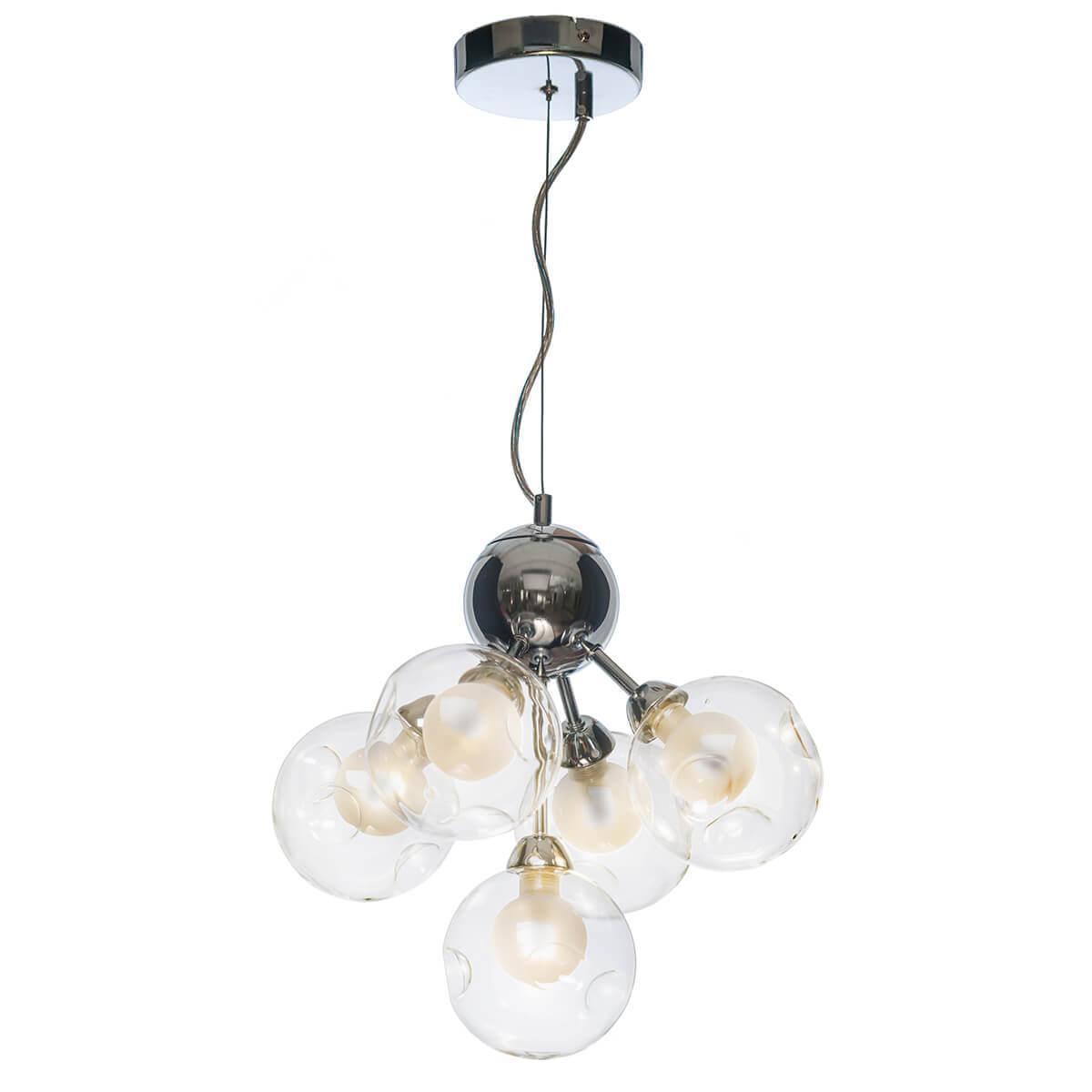 Люстра оснащена пятью галогеновыми лампами по 28 Вт каждая, обеспечивая яркое и равномерное освещение в комнате. Диаметр плафона составляет 320 мм, а высота подвеса - 1600 мм, что позволяет создать эффектный акцент в интерьере.