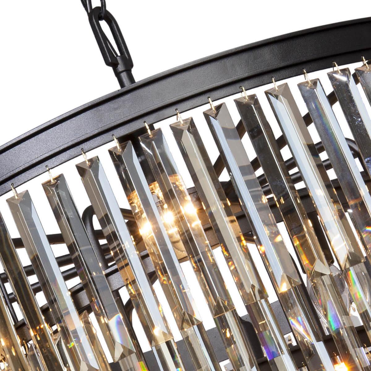 Высота подвесной люстры составляет 3180 мм, диаметр – 820 мм. Цвет основания черный, что придает изделию стильный и современный вид. Установка осуществляется на потолок, что позволяет равномерно распределить свет по всему помещению.