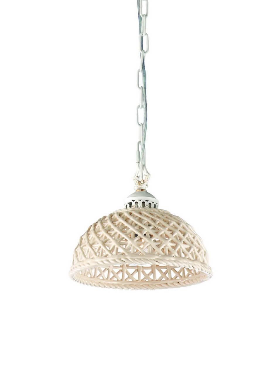 Основание светильника выполнено из металла в белом цвете, а плафон из керамики также имеет белый оттенок. Диаметр плафона составляет 260 мм, а высота - 350 мм. Светильник устанавливается на потолок и работает от лампы с цоколем E27 и мощностью 75 Вт.