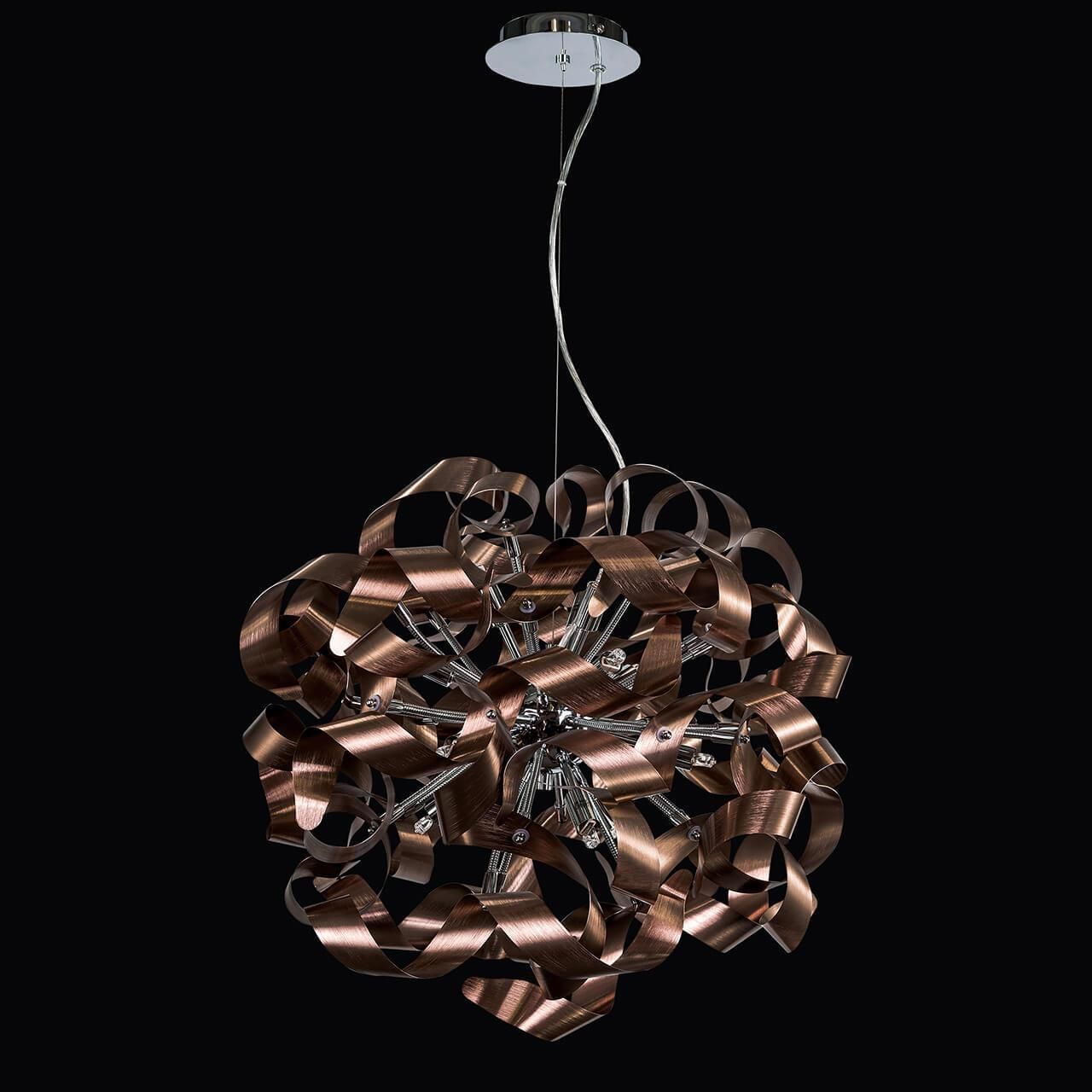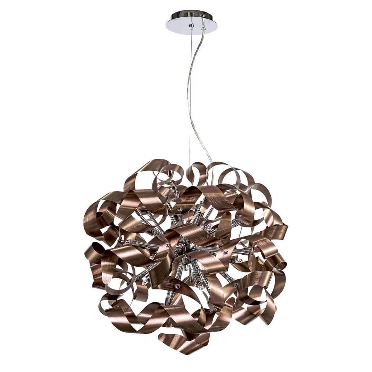 Светильник имеет 12 ламп, общая мощность которых составляет 480 Вт. Плафон изготовлен из металла, имеет диаметр 650 мм и коричневый цвет. Основание также выполнено из металла, окрашено в никель и обладает декоративной формой.