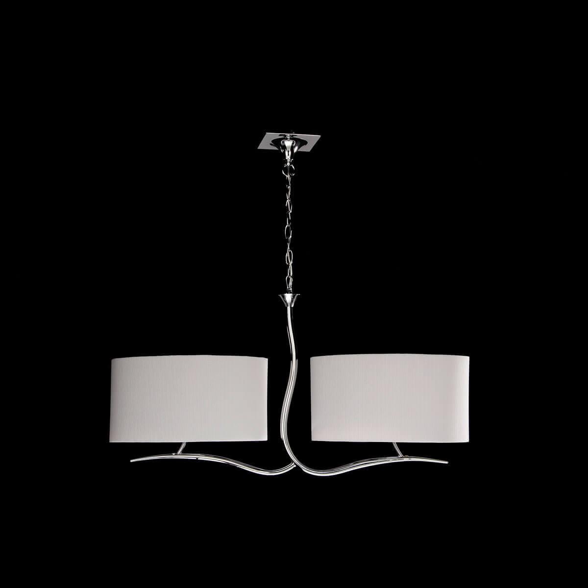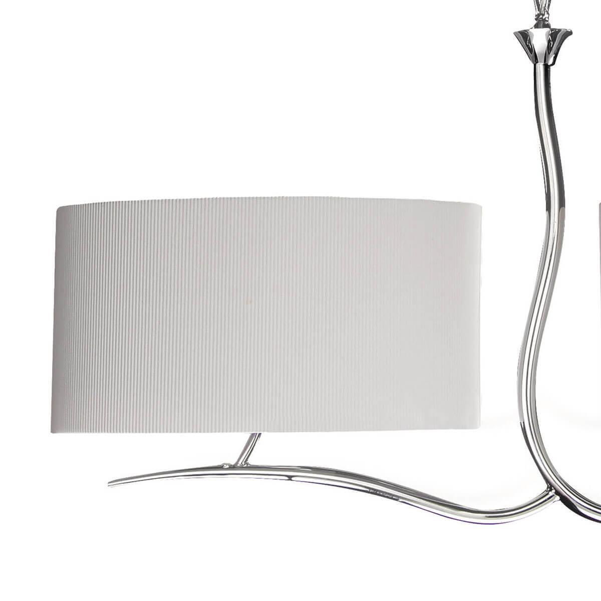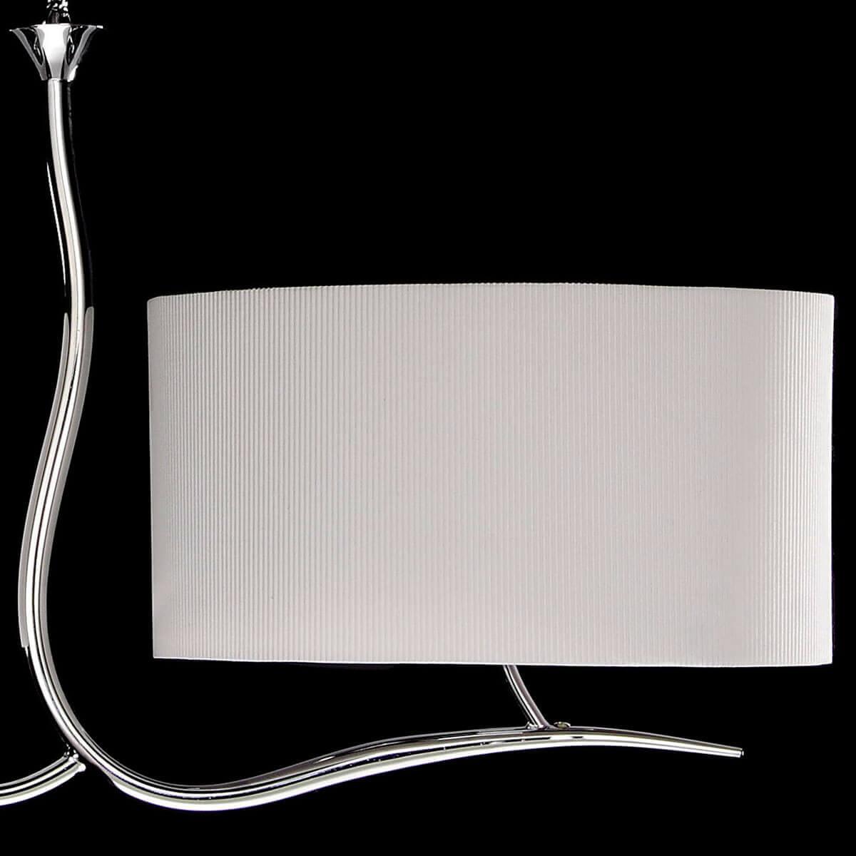 Плафон и абажур изготовлены из качественной ткани белого цвета, что придает светильнику легкость и изысканность. Основание выполнено из металла с отделкой под хром, что придает конструкции прочность и долговечность.