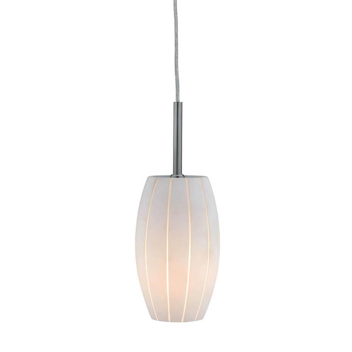 Плафон из стекла имеет овальную форму и белый цвет, что придает светильнику легкость и изящность. Основание выполнено из металла с хромированным покрытием, что придает ему современный и стильный вид.