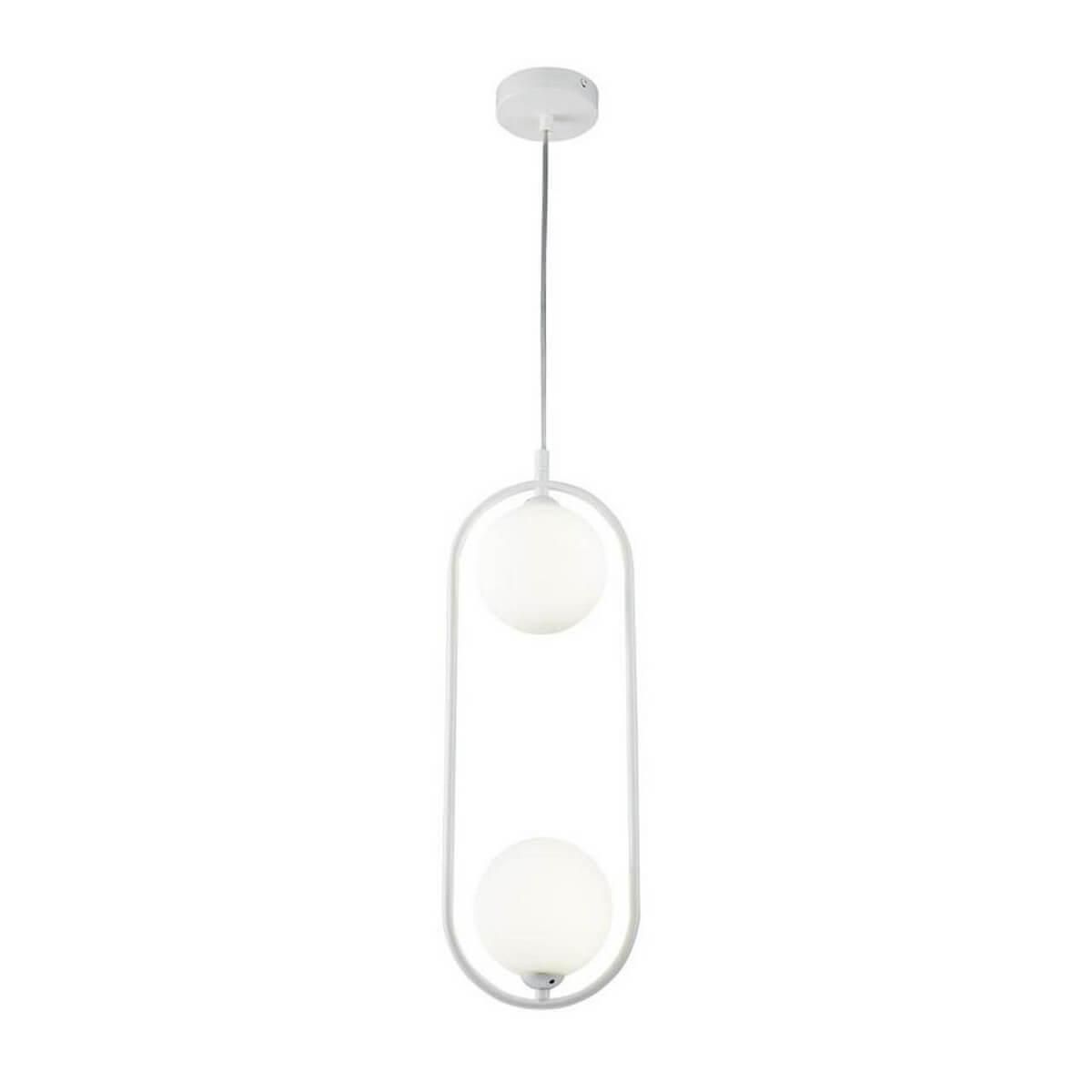 Высота светильника составляет 480 мм, а он устанавливается на потолок. Плафон и абажур изготовлены из прочного стекла, а основание выполнено из металла, окрашенного в белый цвет.