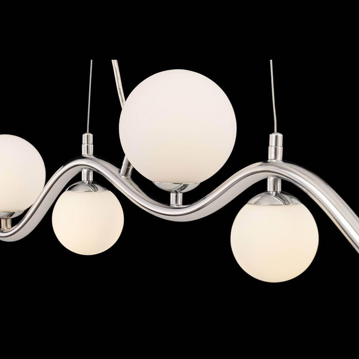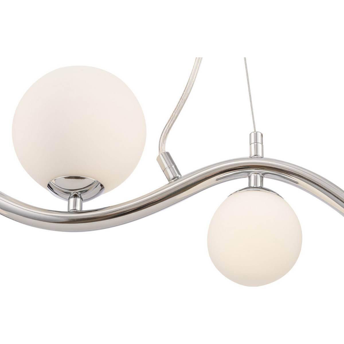 Плафон и абажур изготовлены из стекла белого цвета, что придает светильнику элегантный и современный вид. Основание выполнено из металла с хромированным покрытием, что обеспечивает надежность и долговечность конструкции.