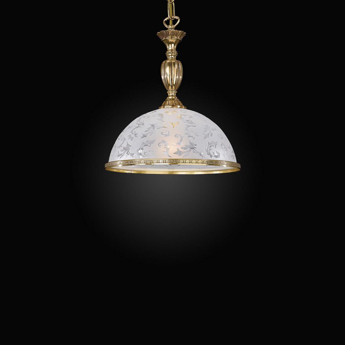 Плафон из стекла имеет форму полукруга и диаметр 280 мм, а основание из латуни окрашено в золотой цвет, что придает светильнику изысканный вид.