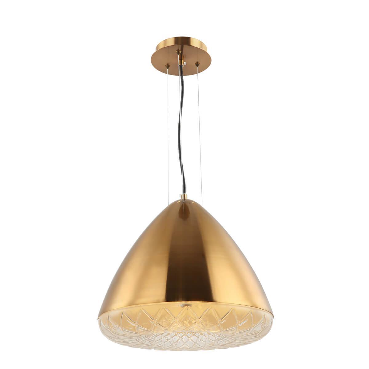 Материал плафона и абажура - металл, а их золотой цвет придает светильнику изысканный вид. Диаметр плафона составляет 370 мм, а высота - 300 мм. Основание светильника также выполнено из металла, окрашенного в медный цвет.