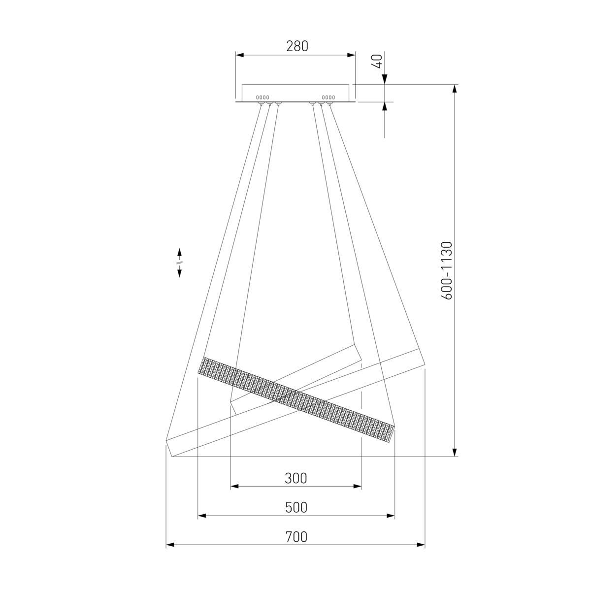 Высота светильника составляет 600 мм, а диаметр - 630 мм. Он устанавливается на потолок и имеет круглую форму плафона из металла в хромированном цвете. Основание также выполнено из металла и имеет цвет хрома.